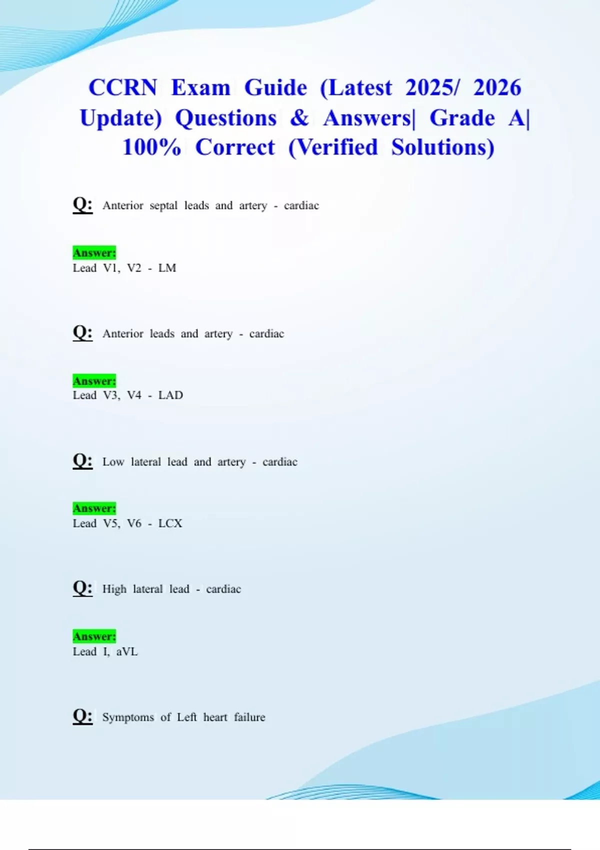 CCRN Exam Guide (Latest 2025/ 2026 Update) Questions & Answers| Grade A| 100% Correct (Verified Solutions) QUESTION Anterior septal leads and artery - cardiac Answer: Lead V1, V2 - LM QUESTION Anterior leads and artery - cardiac Answer: Lead V3, V4 - LAD QUESTION Low lateral lead and artery - cardiac Answer: Lead V5, V6 - LCX QUESTION High lateral lead - cardiac Answer: Lead I, aVL QUESTION Symptoms of Left heart failure Answer: Orthopnea, dyspnea, crackles, Low PaO2, SaO2 & SpO2, S3 & S4, Increased PAOP & PA pressures QUESTION Symptoms of Right heart failure Answer: JVD, Peripheral edema, Hepatomegaly, Increased CVP/RAP, S3 & S4 QUESTION Symptoms of Systolic heart failure Answer: Decreased stroke volume, decreased ejection fraction, S3 and enlarged heart QUESTION Symptoms of Diastolic heart failure Answer: Decreased stroke volume, normal ejection fraction, S4, normal heart size QUESTION Laboratory signs of DIC Answer: Decreased platelets Increased PT/INR Increased aPTT Decreased fibrinogen Increased FSP Increased D-Dimer QUESTION Physical signs of DIC Answer: Hypotension, Petechia, Purpura, Bruising, Bleeding in oral, GI/GU, or pulmonary QUESTION Chvostek's Sign Answer: Facial muscle twitching when cheek is tapped - Hypocalcemia QUESTION Trousseau's Sign