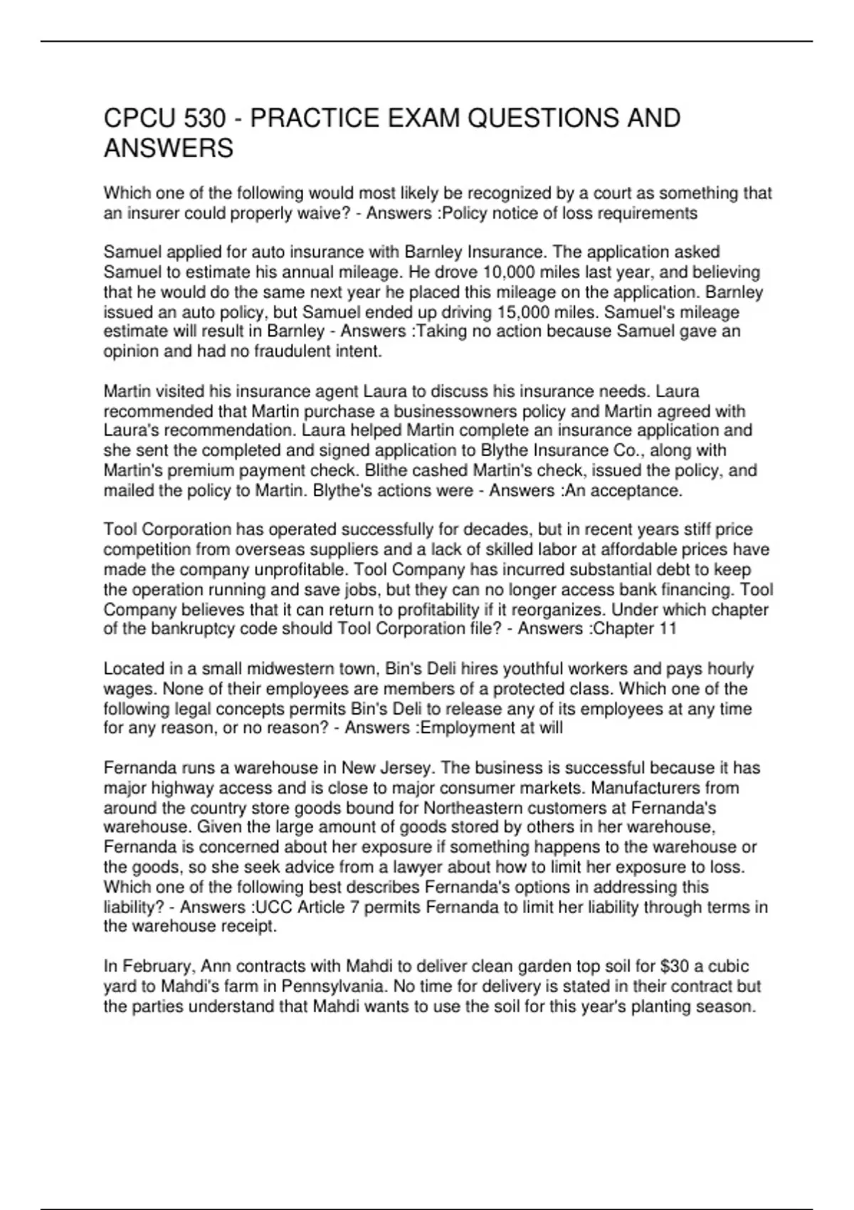 CPCU 530 - PRACTICE EXAM QUESTIONS AND