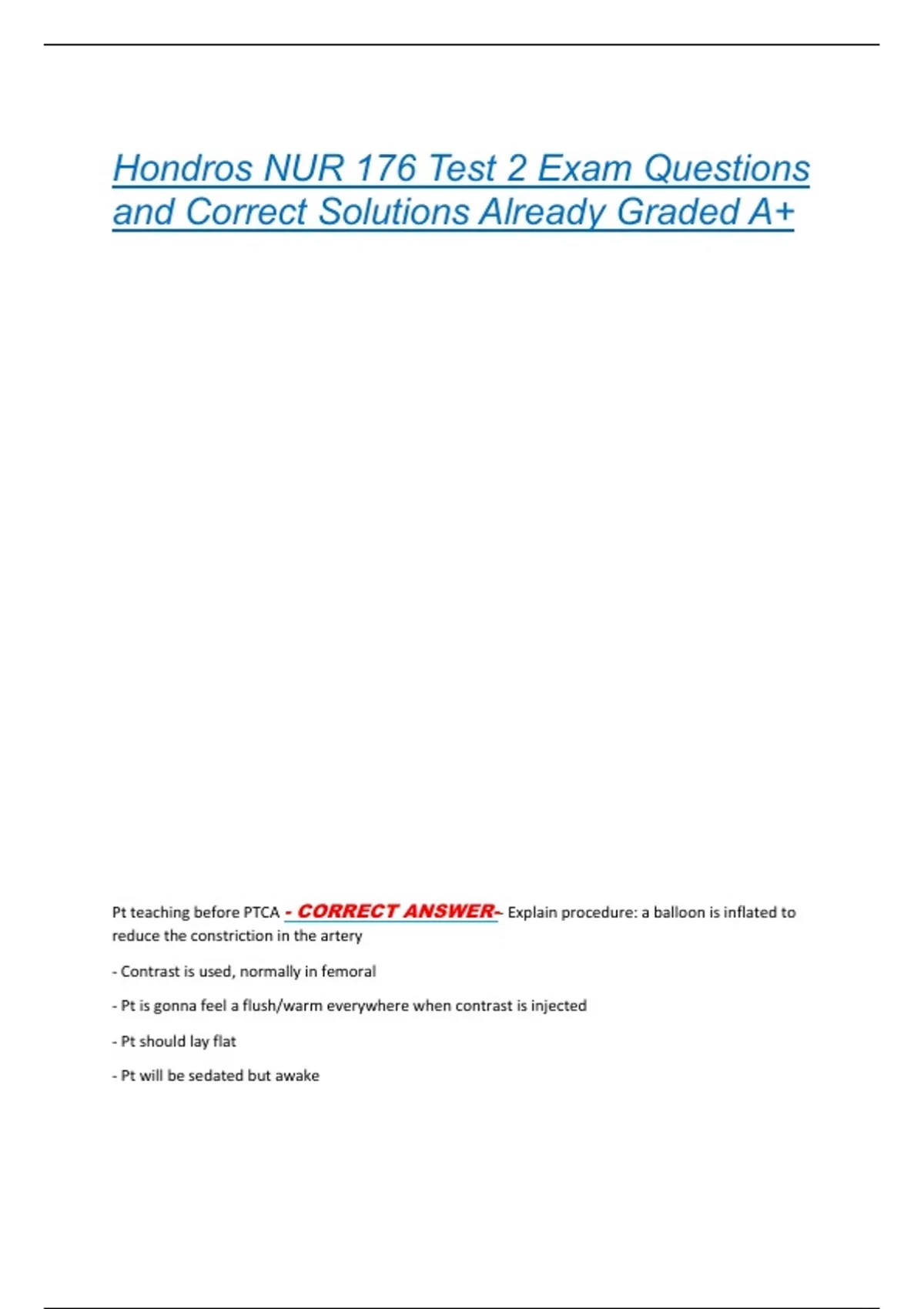 Pt teaching before PTCA - CORRECT ANSWER-- Explain procedure: a balloon is inflated to