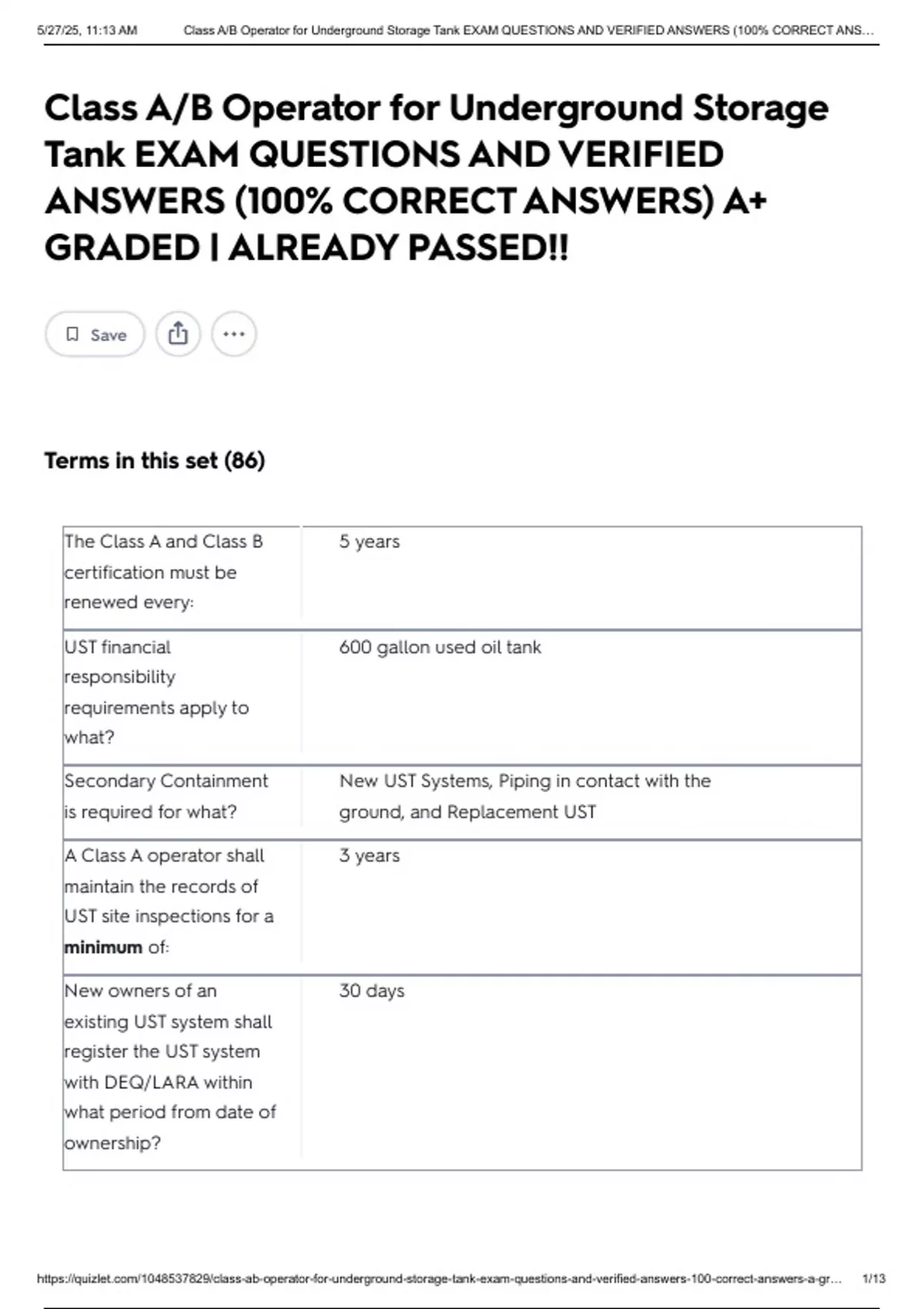5/27/25, 11:13 AM Class A/B Operator for Underground Storage Tank EXAM QUESTIONS AND VERIFIED ANSWERS (100% CORRECT ANS…