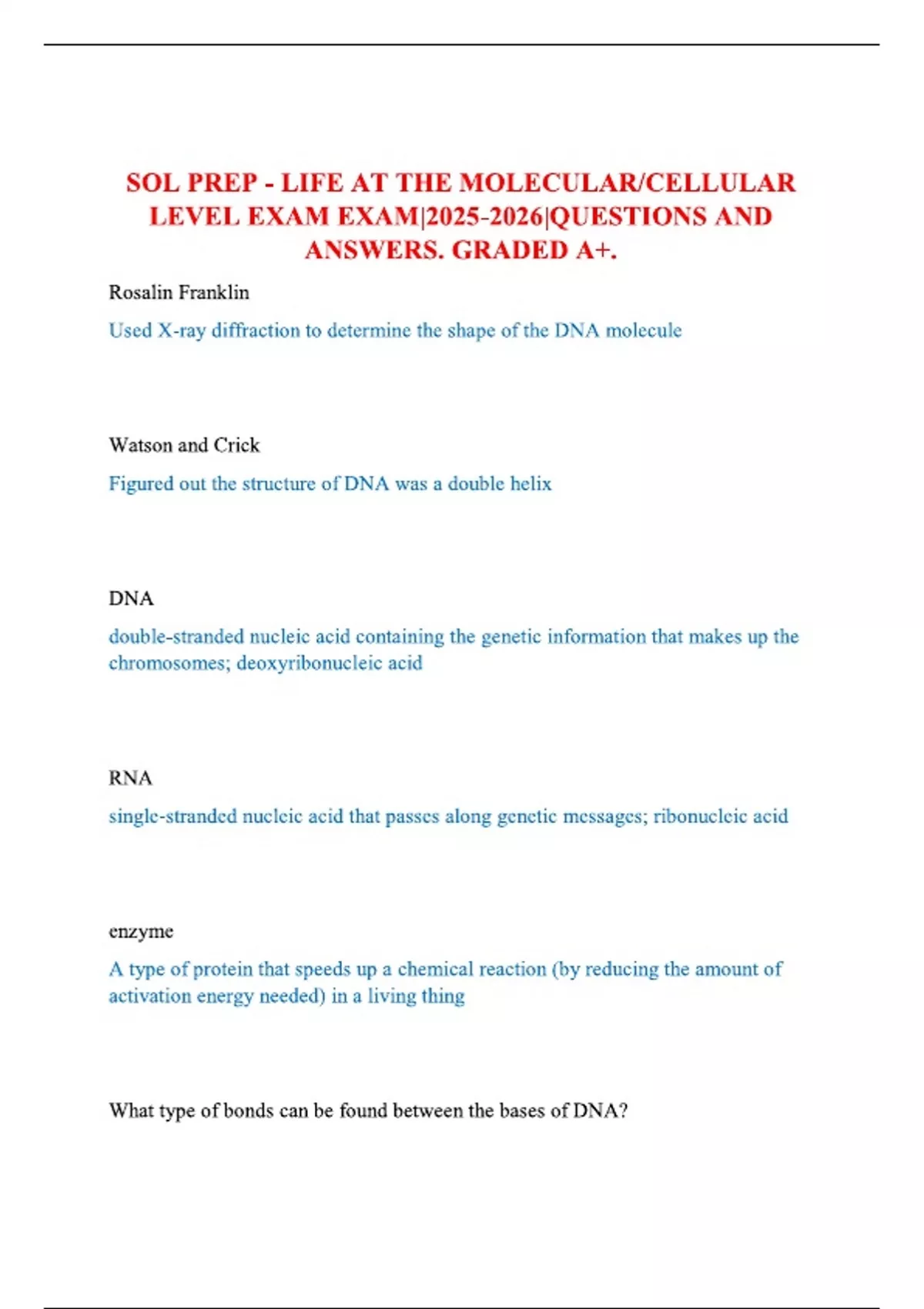SOL PREP - LIFE AT THE MOLECULAR/CELLULAR LEVEL EXAM EXAM||QUESTIONS AND ANSWERS. GRADED A+.