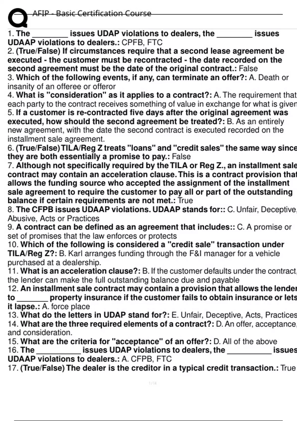 17. (True/False) The dealer is the creditor in a typical credit transaction.: True