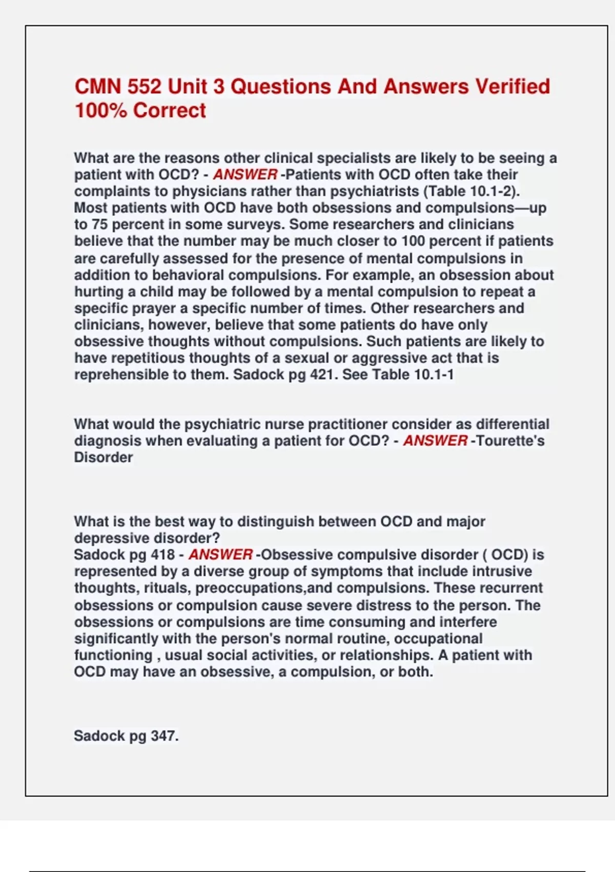 CMN 552 Unit 3 Questions And Answers Verified 100% Correct What are the reasons other clinical specialists are likely to be seeing a patient with OCD? - ANSWER -Patients with OCD often take their complaints to physicians rather than psychiatrists (Table 10.1-2). Most patients with OCD have both obsessions and compulsions—up to 75 percent in some surveys. Some researchers and clinicians believe that the number may be much closer to 100 percent if patients are carefully assessed for the presence of mental compulsions in addition to behavioral compulsions. For example, an obsession about hurting a child may be followed by a mental compulsion to repeat a specific prayer a specific number of times. Other researchers and clinicians, however, believe that some patients do have only obsessive thoughts without compulsions. Such patients are likely to have repetitious thoughts of a sexual or aggressive act that is reprehensible to them. Sadock pg 421. See Table 10.1-1 What would the psychiatric nurse practitioner consider as differential diagnosis when evaluating a patient for OCD? - ANSWER -Tourette's Disorder What is the best way to distinguish between OCD and major depressive disorder? Sadock pg 418 - ANSWER -Obsessive compulsive disorder ( OCD) is represented by a diverse group of symptoms that include intrusive thoughts, rituals, preoccupations,and compulsions. These recurrent obsessions or compulsion cause severe distress to the person. The obsessions or compulsions are time consuming and interfere significantly with the person's normal routine, occupational functioning , usual social activities, or relationships. A patient with OCD may have an obsessive, a compulsion, or both. Sadock pg 347. A major depressive disorder occurs without a history of a manic,mixed ,or hypomanic episode. A major depressive episode must last at least 2 weeks , and typically a person with a diagnosis of a major depressive episode also experiences at least four symptoms from a list that includes changes in appetite and weight , changes in sleep and activity ,lack of energy , feelings of guilt , problems thinking and making decisions, and recurring thoughts of suicide. Review the pharmacotherapy treatment options for OCD. Sadock, pp. 424-425. - ANSWER -The standard approach is to start treatment with an SSRI or clomipramine and then to move to other pharmacological strategies if the serotonin-specific drugs are not effective. The serotonergic drugs have increased the percentage of patients with OCD who are likely to respond to treatment to the range of 50 to 70 percent. Each of the SSRIs available in the United States has been approved by the FDA for the treatment of OCD. Higher dosages have often been necessary for a beneficial effect, such as 80 mg a day of fluoxetine. SSRI side effects are generally less troubling than the adverse effects associated with tricyclic drugs such as clomipramine. Clomipramine: The most selective for serotonin reuptake versus norepinephrine reuptake and is exceeded in this respect only by the SSRIs. The potency of serotonin reuptake of clomipramine is exceeded only by sertraline and paroxetine. Its dosing must be titrated upward over 2 to 3 weeks to avoid gastrointestinal adverse effects and orthostatic hypotension, and as with other tricyclic drugs, it causes significant sedation and anticholinergic effects, including dry mouth and constipation. As with SSRIs, the best outcomes result from a combination of drug and behavioral therapy. Other drugs: Augment the first drug by the addition of valproate, lithium, or carbamazepine. Other drugs that can be tried in the treatment of OCD are venlafaxine, pindolol, and the monoamine oxidase inhibitors, especially phenelzine (Nardil). Other pharmacological agents for the treatment of unresponsive patients include Buspar, 5-hydroxytryptamine (5-HT), L-tryptophan, and clonazepam. Adding an atypical antipsychotic such as risperidone has helped in some cases. Review the psychosocial treatment options for OCD. Sadock, pp. 424426 - ANSWER -Psychodynamic exploration of a patient's resistance to treatment may improve compliance. Well-controlled studies have found that pharmacotherapy, behavior therapy, or a combination of both is effective in significantly reducing the symptoms of patients with OCD. The decision about which therapy to use is based on the clinician's judgment and experience and the patient's acceptance of the various modalities. Behavior therapy - Behavior therapy is as effective as pharmacotherapies in OCD, and some data indicate that the beneficial effects are longer lasting with behavior therapy. Many clinicians, therefore, consider behavior therapy the treatment of choice for OCD. Behavior therapy can be conducted in both outpatient and inpatient settings. The principal behavioral approaches in OCD are exposure and response prevention. Desensitization, thought stopping, flooding, implosion therapy, and aversive conditioning have also been used. Psychotherapy: Individual analysts have seen striking and lasting changes for the better in patients with obsessive-compulsive personality disorder, especially when they are able to come to terms with the aggressive impulses underlying their character traits. Some clinicians have observed marked symptomatic improvement in patients with OCD in the course of analysis or prolonged insight psychotherapy.