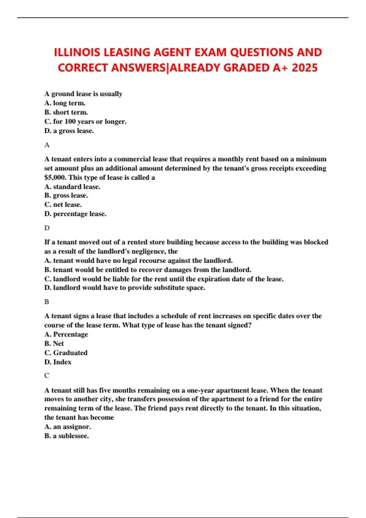 ILLINOIS LEASING AGENT EXAM QUESTIONS AND CORRECT ANSWERS|ALREADY GRADED A+ 2025