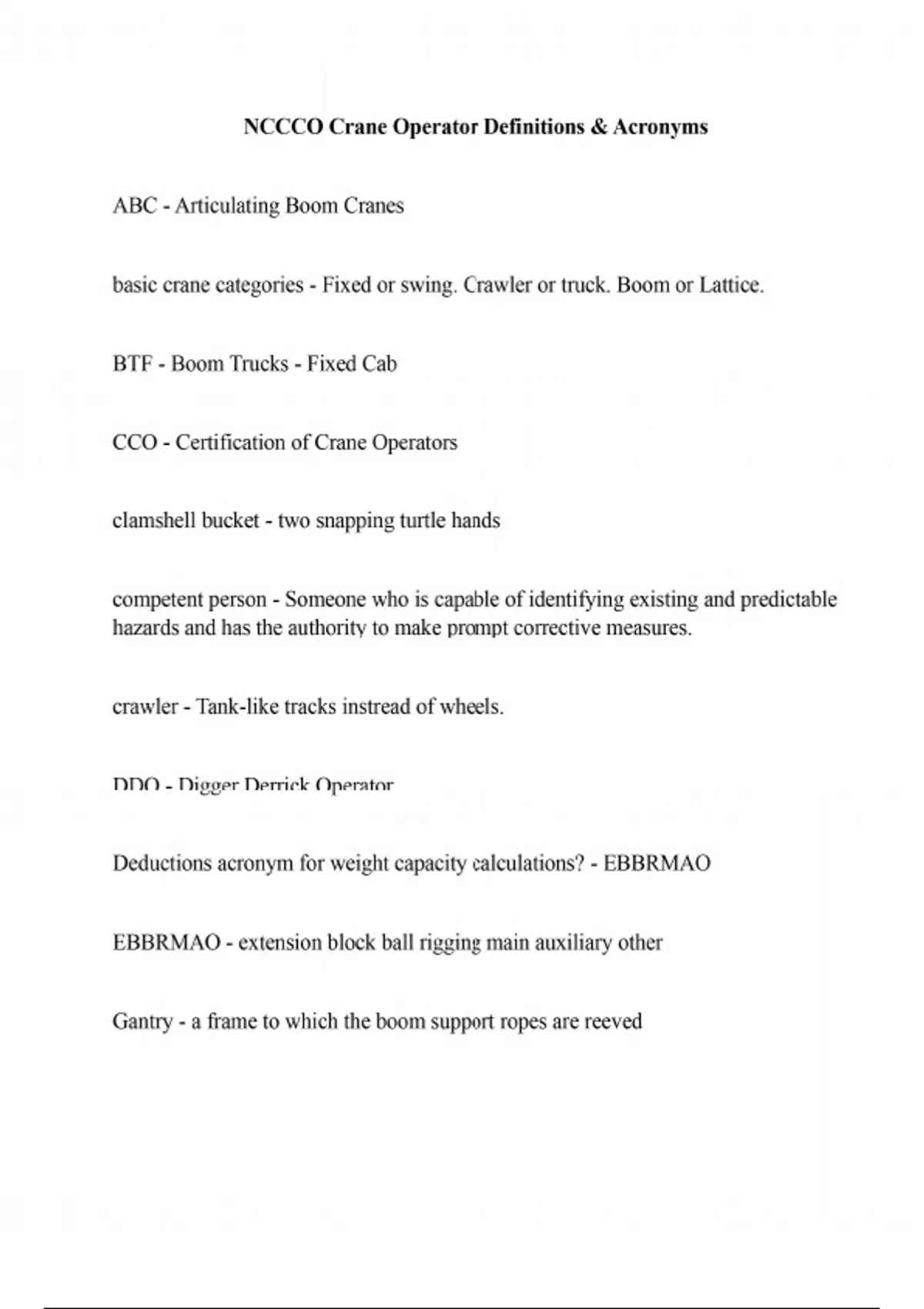 GOUND LEVEL REEVING ROPES FLUIDS CONTROLS SAFETY SHUTDOWN - GLRRFCSS inspection 01 ground - 1 level 2 proper support 3 ground settling near outriggers 4 ground water accumulation 5 underground utilities inspection 02 level - 1 Level within 1% before each shift. 2 Level after each move. 3. Sufficient cribbing. inspection 03 reeving - 1 wire rope off sheave or wrong sheave 2 damaged sheaves 3 improper drum spooling 4 bird nesting inspection 04 rope - 1 broken wires 2 kinks 3 bird caging 4 crushing 5 corrosion 6 lack of lubrication 7 peening inspection 05 fluids - 1 engine 2 torque converter 3 hydraulics 4 fuel 5 coolant inspection 06 controls - 1 levers and peddles 2 labeling and function inspection 07 safety devices - 1 LMI 2 anti two-block 3 horns inspection 08 shutdown - 1 boom safe angle 2 ball/block secured or raised safe height 3 brakes & locks engaged 4 shut off engine 5 remove key 6 close lock windows inspection acronym - GLRRFCSS IWRC - Independent Wire Rope Core