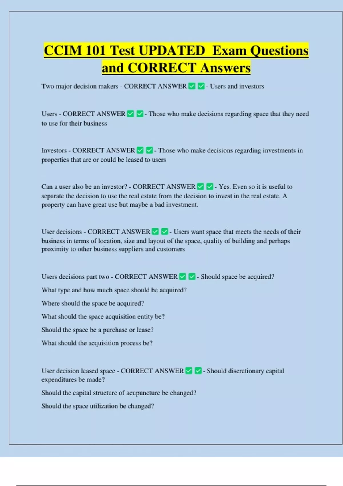 CCIM 101 Test UPDATED Exam Questions and CORRECT Answers Two major decision makers - CORRECT ANSWER Users - CORRECT ANSWER - Users and investors - Those who make decisions regarding space that they need to use for their business Investors - CORRECT ANSWER - Those who make decisions regarding investments in properties that are or could be leased to users Can a user also be an investor? - CORRECT ANSWER - Yes. Even so it is useful to separate the decision to use the real estate from the decision to invest in the real estate. A property can have great use but maybe a bad investme