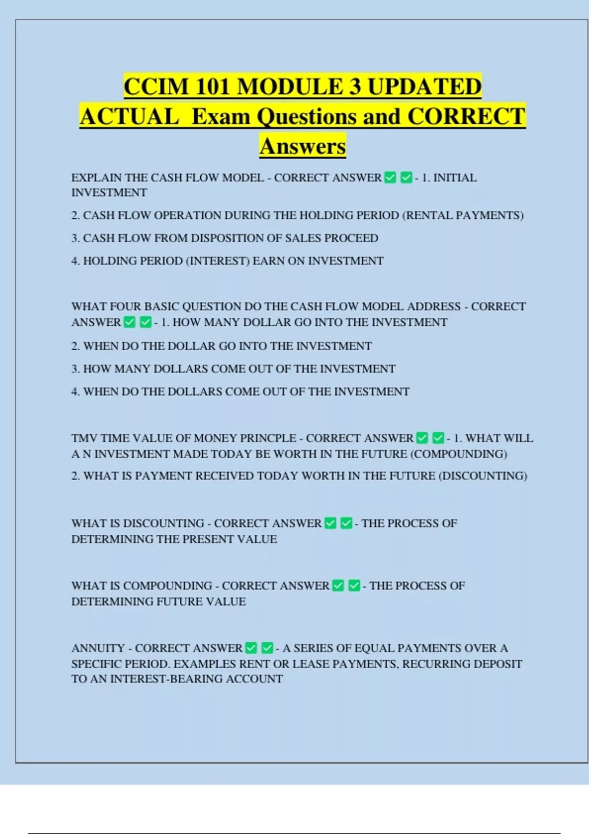 CCIM 101 MODULE 3 UPDATED ACTUAL Exam Questions and CORRECT Answers EXPLAIN THE CASH FLOW MODEL - CORRECT ANSWER INVESTMENT - 1. INITIAL 2. CASH FLOW OPERATION DURING THE HOLDING PERIOD (RENTAL PAYMENTS) 3. CASH FLOW FROM DISPOSITION OF SALES PROCEED 4. HOLDING PERIOD (INTEREST) EARN ON INVESTMENT WHAT FOUR BASIC QUESTION DO THE CASH FLOW MODEL ADDRESS - CORRECT ANSWER - 1. HOW MANY DOLLAR GO INTO THE INVESTM