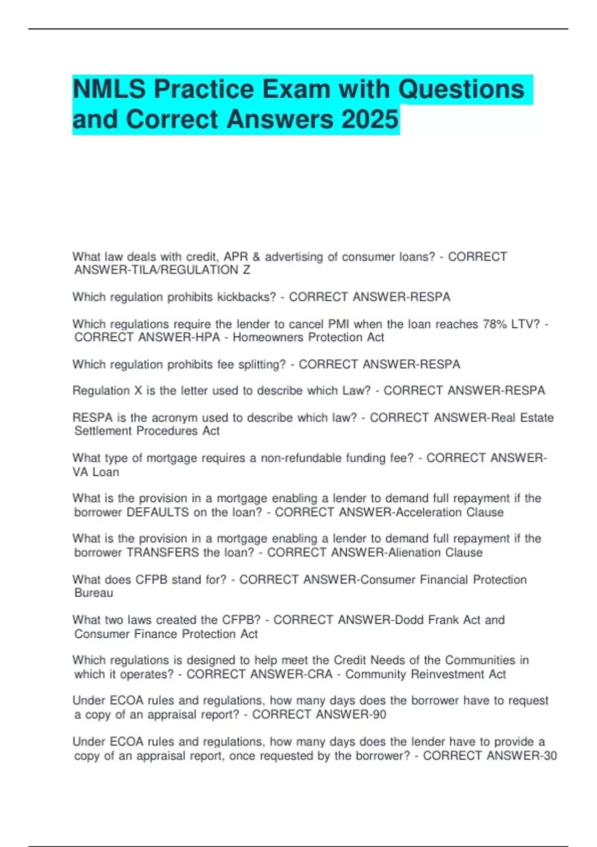 NMLS Practice Exam with Questions and Correct Answers 2025.