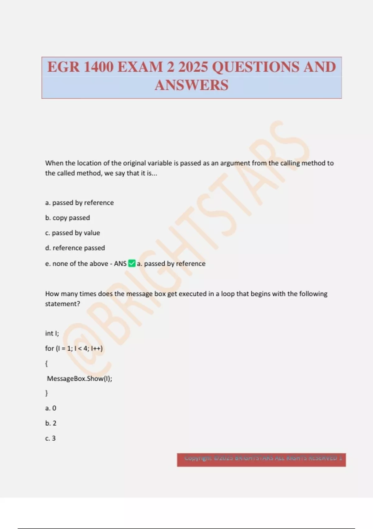 When the location of the original variable is passed as an argument from the calling method to the called method, we say that it is... a. passed by reference b. copy passed c. passed by value d. reference passed e. none of the above - ANS a. passed by reference How many times does the message box get executed in a loop that begins with the following statement? int I; for (I = 1; I < 4; I++) { MessageBox.Show(I); } a. 0 b. 2 c. 3 EGR 1400 EXAM 2 2025 QUESTIONS AND ANSWERS Copyright ©2025 BRIGHTSTARS ALL RIGHTS RESERVED 2 d. 1 e. none of the above - ANS c. 3 What is the value of the variable I after the loop is finished executing? int I; for (I = 1; I < 4; I++) { MessageBox.Show(I); } a. 1 b. 2 c. 3 d. 4 e. none of the above - ANS d. 4 How many locations will there be for an array declared as: string[ ] Names = new string[4]; a. 4 b. 3 c. 2 d. 1 e. none of the above - ANS a. 4 After the code is finished executing, what is the value of A[1]? Copyright ©2025 BRIGHTSTARS ALL RIGHTS RESERVED 3 int[ ] A = new int[5]; int[ ] B = new int[3]; int x; for (x = 0; x < 5; x++) { A[x] = x * 2 + 4; } a. 10 b. 8 c. 6 d. 0 e. none of the above - ANS c. 6 What is the maximum index of the array, B? int[ ] A = new int[5]; int[ ] B = new int[3]; int x; for (x = 0; x < 5; x++) { A[x] = x * 2 + 4; } a. 0 b. 2 c. 3