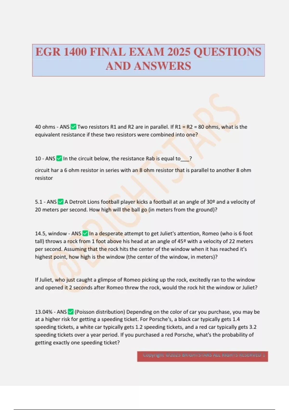 40 ohms - ANS Two resistors R1 and R2 are in parallel. If R1 = R2 = 80 ohms, what is the equivalent resistance if these two resistors were combined into one? 10 - ANS In the circuit below, the resistance Rab is equal to___? circuit har a 6 ohm resistor in series with an 8 ohm resistor that is parallel to another 8 ohm resistor 5.1 - ANS A Detroit Lions football player kicks a football at an angle of 30º and a velocity of 20 meters per second. How high will the ball go (in meters from the ground)? 14.5, window - ANS In a desperate attempt to get Juliet's attention, Romeo (who is 6 foot tall) throws a rock from 1 foot above his head at an angle of 45º with a velocity of 22 meters per second. Assuming that the rock hits the center of the window when it has reached it's highest point, how high is the window (the center of the window, in meters)? If Juliet, who just caught a glimpse of Romeo picking up the rock, excitedly ran to the window and opened it 2 seconds after Romeo threw the rock, would the rock hit the window or Juliet? 13.04% - ANS (Poisson distribution) Depending on the color of car you purchase, you may be at a higher risk for getting a speeding ticket. For Porsche's, a black car typically gets 1.4 speeding tickets, a white car typically gets 1.2 speeding tickets, and a red car typically gets 3.2 speeding tickets over a year period. If you purchased a red Porsche, what's the probability of getting exactly one speeding ticket? EGR 1400 FINAL EXAM 2025 QUESTIONS AND ANSWERS Copyright ©2025 BRIGHTSTARS ALL RIGHTS RESERVED 2 d - ANS A company that makes toy Elmo dolls has a chief inspector named Vrisken. In three hours, an average of 2 (two) crates of dolls are rejected because they contain more than 4 randomly inspected faulty dolls (bad smell, discolored, doesn't speak, swears, etc...). What is the probability of less than 2 crates of Elmo dolls being rejected in a three-hour period? (Assume that this plant operates 24 hours per day, 7 days per week). a. 1.83 % b. 27.07 % c. 16.48 % d. None of these e. 13.53 % 6/36 - ANS What is the probability of rolling a total of 7 (seven) on a pair of standard dice? 27.78% - ANS What is the probability of rolling a total of 5 (five) on a pair of dice with these sides: (1, 1, 2, 3, 4, 4)? 95% - ANS What percentage of candidates have an age between 21 and 29 years from a group of people with normally distributed ages with an average age of 25 years old and a standard deviation of 2 years? b - ANS Calculate the standard deviation for the data set: 1, 2, 2, 4, 7 a. Copyright ©2025 BRIGHTSTARS ALL RIGHTS RESERVED 3 4.77 b. None of these c. 2.81 d. 3.20 e. 2.39 a - ANS In C#, you can simulate rolling two dice by selecting a random number between 1 and 6 to represent each die roll and then adding them together to get the dice total. Let's say that we developed a program to do this and we rolled the pair of dice 50 times and recorded the results of each roll on a sheet of paper. Instead of using two die separately and totaling them (which would result in a total between 2 and 12), can we just select one random number between 2 and 12 and achieve the same experimental results for the 50 rolls as rolling two die and adding them? a. No, it's not possible to get the same experimental results with one random number b. Yes, using the same scaling as before c. Yes, if the Visual C# code is written to scale the single random number between 2 and 12 d. Yes, if the random number is selected using myRand.Next(2,13); the Text property - ANS What property of a Label control would you need to set to change the words displayed