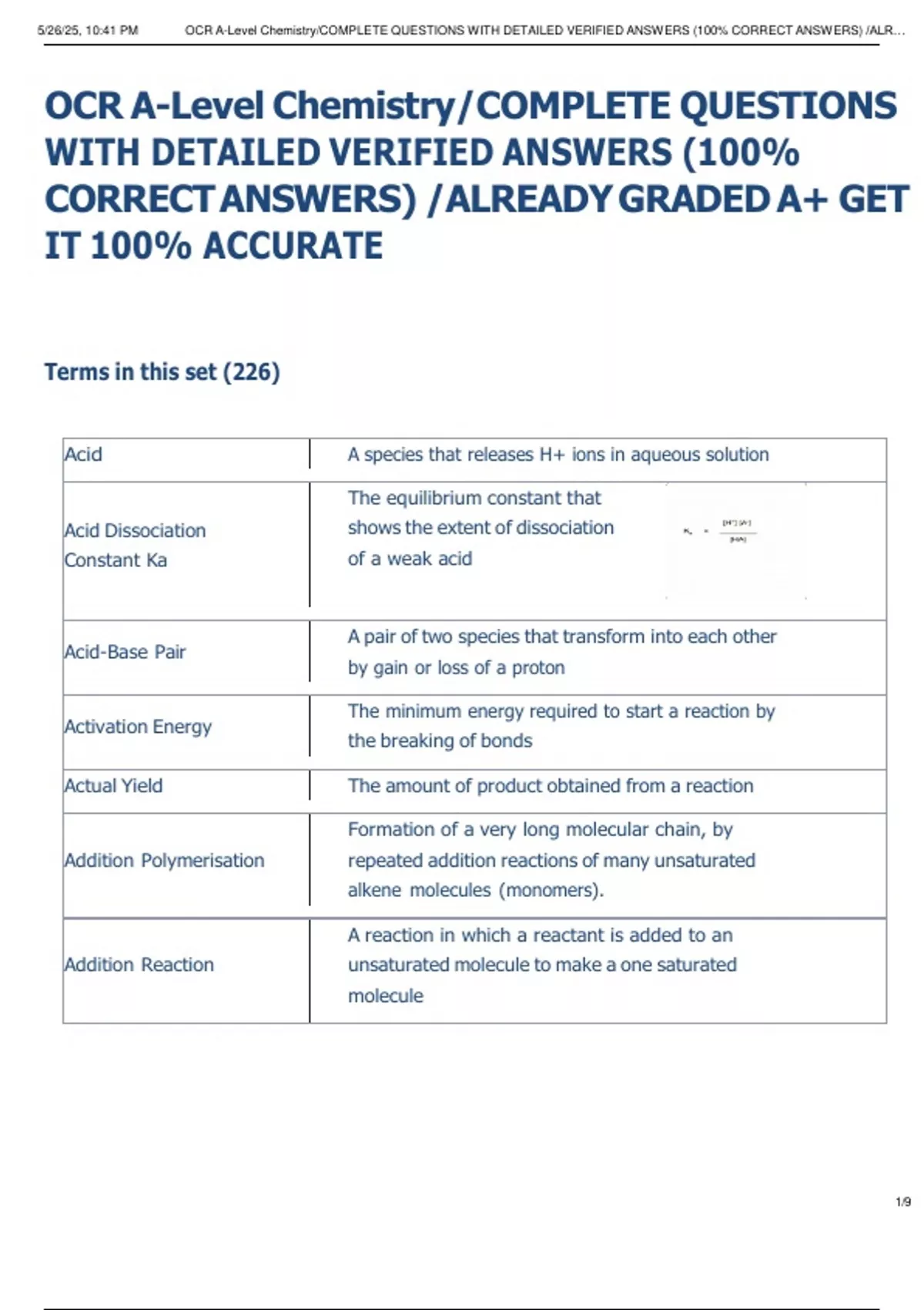 , 5/26/25, 10:41 PM OCR A-Level Chemistry/COMPLETE QUESTIONS WITH DETAILED VERIFIED ANSWERS (100% CORRECT ANSWERS) /ALR…
