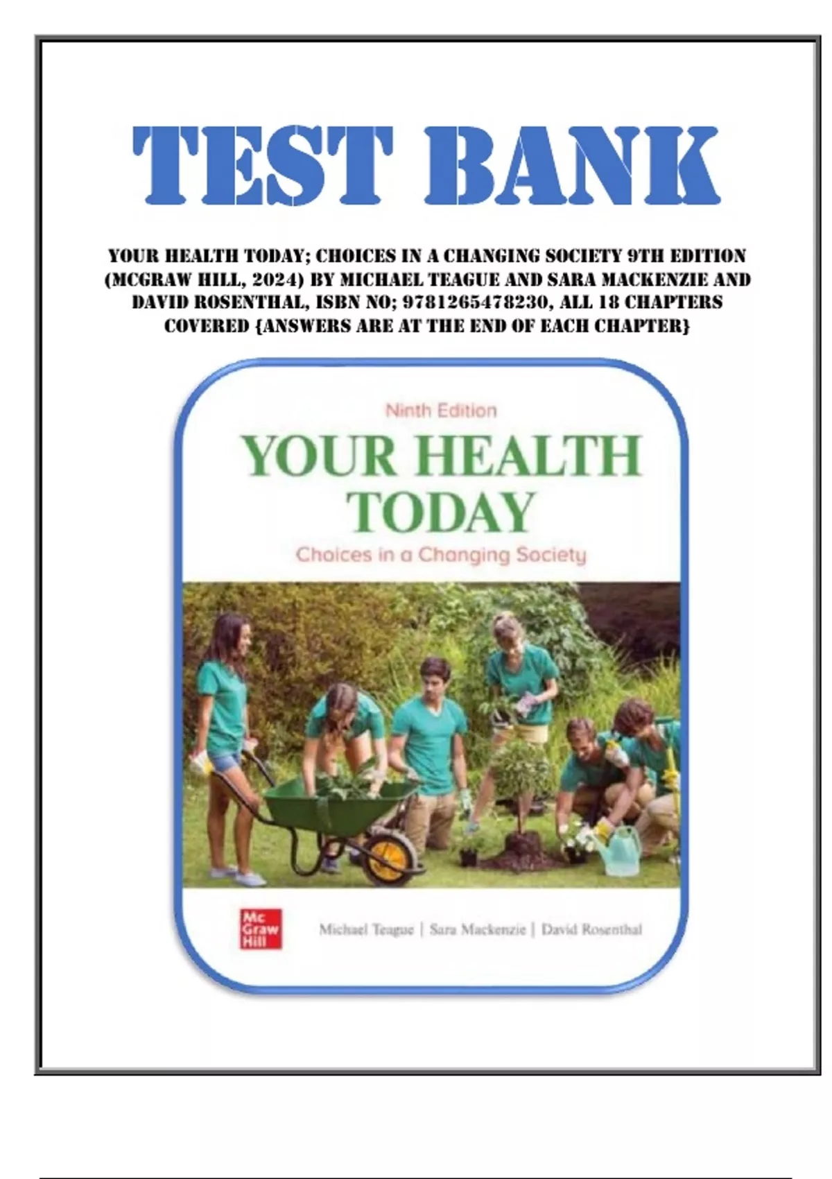 Test Bank for Your Health Today; Choices in a Changing Society 9th Edition (McGraw Hill, 2023) by Teague and Mackenzie and Rosenthal, Isbn no; 9781264127290, all 18 Chapters Covered