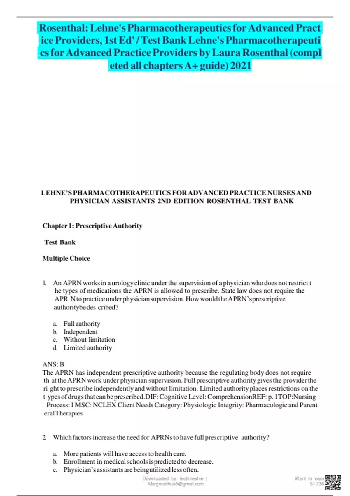 ice Providers, 1st Ed' / Test Bank Lehne's Pharmacotherapeuti