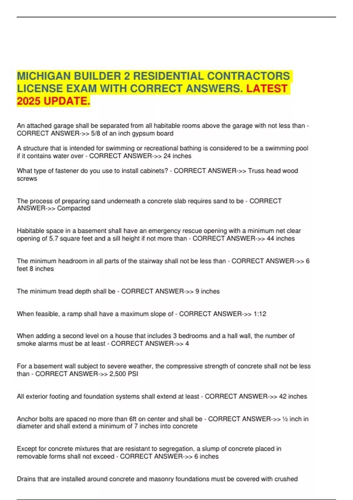 MICHIGAN BUILDER 2 RESIDENTIAL CONTRACTORS LICENSE EXAM WITH CORRECT ANSWERS. LATEST 2025 UPDATE. An attached garage shall be separated from all habitable rooms above the garage with not less than - CORRECT ANSWER->> 5/8 of an inch gypsum board A structure that is intended for swimming or recreational bathing is considered to be a swimming pool if it contains water over - CORRECT ANSWER->> 24 inches What type of fastener do you use to install cabinets? - CORRECT ANSWER->> Truss head wood screws The process of preparing sand underneath a concrete slab requires sand to be - CORRECT ANSWER->> Compacted Habitable space in a basement shall have an emergency rescue opening with a minimum net clear opening of 5.7 square feet and a sill height if not more than - CORRECT ANSWER->> 44 inches The minimum headroom in all parts of the stairway shall not be less than - CORRECT ANSWER->> 6 feet 8 inches The minimum tread depth shall be - CORRECT ANSWER->> 9 inches When feasible, a ramp shall have a maximum slope of - CORRECT ANSWER->> 1:12 When adding a second level on a house that includes 3 bedrooms and a hall wall, the number of smoke alarms must be at least - CORRECT ANSWER->> 4 For a basement wall subject to severe weather, the compressive strength of concrete shall not be less than - CORRECT ANSWER->> 2,500 PSI All exterior footing and foundation systems shall extend at least - CORRECT ANSWER->> 42 inches Anchor bolts are spaced no more than 6ft on center and shall be - CORRECT ANSWER->> ½ inch in diameter and shall extend a minimum of 7 inches into concrete Except for concrete mixtures that are resistant to segregation, a slump of concrete placed in removable forms shall not exceed - CORRECT ANSWER->> 6 inches Drains that are installed around concrete and masonry foundations must be covered with crushed stones with minimum thickness of - CORRECT ANSWER->> 6 inches A concrete mix of 1:2:4 means - CORRECT ANSWER->> 1 part cement, 2 parts sand and 4 parts aggregate Masonry veneer shall be anchored to the supporting wall with corrosion-resistant metal ties embedded in water and extending into the veneer a minimum of - CORRECT ANSWER->> 1 1/2 inches Fasteners for asphalt shingles shall be galvanized or stainless steel with a minimum 12 gage shank and it must be of a length that penetrates a minimum of into the roof sheathing - CORRECT ANSWER->> ¾ inch An ice barrier shall consist of at least 2 layers of underlayment cemented together and shall extend at least inside the exterior wall line of the building - CORRECT ANSWER->> 24 inches An employer who willfully violates the Michigan Occupational Safety and Health Administration (MIOSHA) rules for the second time and which violation causes death to an employee shall be fined the following - CORRECT ANSWER->> Not more than $20,000 or three years in prison or both According to MIOSHA, when an employee may be exposed to electrical shock of more than 600 volts, a helmet must be worn with the following classification - CORRECT ANSWER->> Class B