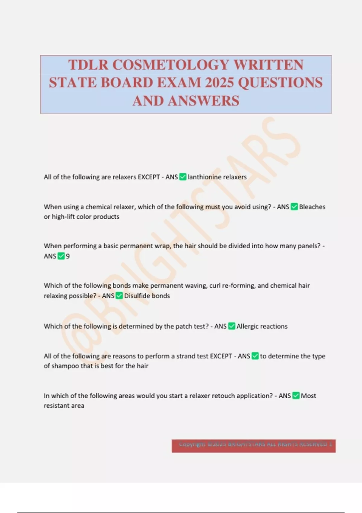 All of the following are relaxers EXCEPT - ANS lanthionine relaxers When using a chemical relaxer, which of the following must you avoid using? - ANS Bleaches or high-lift color products When performing a basic permanent wrap, the hair should be divided into how many panels? - ANS 9 Which of the following bonds make permanent waving, curl re-forming, and chemical hair relaxing possible? - ANS Disulfide bonds Which of the following is determined by the patch test? - ANS Allergic reactions All of the following are reasons to perform a strand test EXCEPT - ANS to determine the type of shampoo that is best for the hair In which of the following areas would you start a relaxer retouch application? - ANS Most resistant area TDLR COSMETOLOGY WRITTEN STATE BOARD EXAM 2025 QUESTIONS AND ANSWERS Copyright ©2025 BRIGHTSTARS ALL RIGHTS RESERVED 2 When using relaxers incorrectly, which of the following could happen? - ANS the hair melts When anaylizing the hair before a chemical relaxer, it is necessary to evaluate the hair for all of the following EXCEPT - ANS color Which of the following equalizes porosity? - ANS fillers Which of the following hair color procedures will lighten hair prior to depositing color? - ANS double process Which step would be performed prior to applying a single-process color on virgin hair? - ANS parting dry hair All of the following are roles of the alkalizer EXCEPT - ANS making a physical change Which hydrogen peroxide developer is used with most high-lift colors? - ANS 40 volume All of the following are determined by a strand test in a color service EXCEPT - ANS how much color to use Which of the following would under-lightened hair leave behind? - ANS orange tint All of the following are toners EXCEPT - ANS low lighting All of the following are im