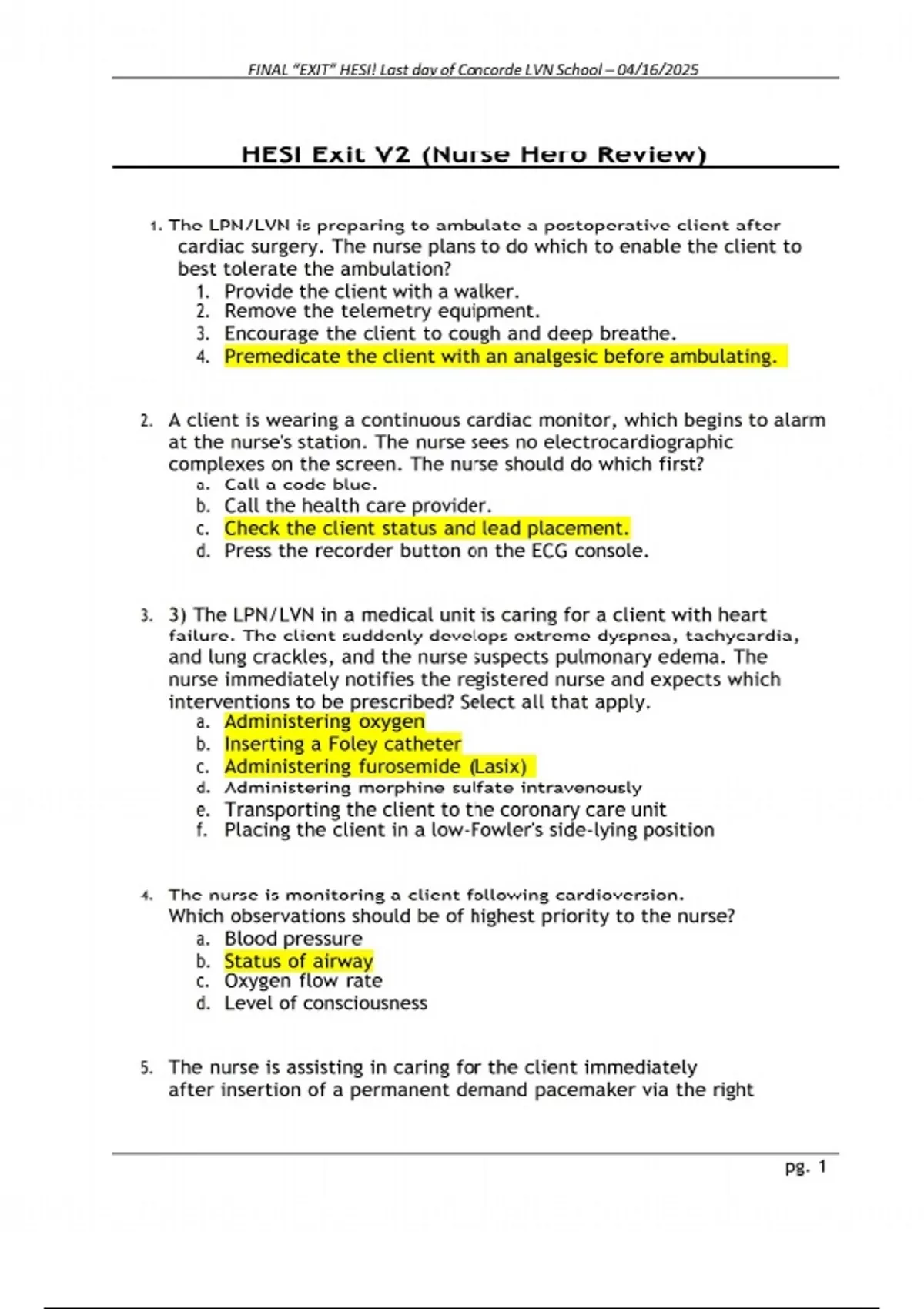 1. The LPN/LVN is preparing to ambulate a postoperative client after cardiac surgery. The nurse plans to do which to enable the client to best tolerate the ambulation? 1. Provide the client with a walker. 2. Remove the telemetry equipment. 3. Encourage the client to cough and deep breathe. 4. Premedicate the client with an analgesic before ambulating. 2. A client is wearing a continuous cardiac monitor, which begins to alarm at the nurse's station. The nurse sees no electrocardiographic complexes on the screen. The nurse should do which first? a. Call a code blue. b. Call the health care provider. c. Check the client status and lead placement. d. Press the recorder button on the ECG console. 3. 3) The LPN/LVN in a medical unit is caring for a client with heart failure. The client suddenly develops extreme dyspnea, tachycardia, and lung crackles, and the nurse suspects pulmonary edema. The nurse immediately notifies the registered nurse and expects which interventions to be prescribed? Select all that apply. a. Administering oxygen b. Inserting a Foley catheter c. Administering furosemide (Lasix) d. Administering morphine sulfate intravenously e. Transporting the client to the coronary care unit f. Placing the client in a low-Fowler's side-lying position 4. The nurse is monitoring a client following cardioversion. Which observations should be of highest priority to the nurse? a. Blood pressure b. Status of airway c. Oxygen flow rate d. Level of consciousness 5. The nurse is assisting in caring for the client immediately after insertion of a permanent demand pacemaker via the right FINAL “EXIT” HESI! Last day of Concorde LVN School – 04/16/2025 pg. 2 subclavian vein. The nurse prevents dislodgement of the pacing catheter by implementing which intervention? a. Limiting movement and abduction of the left arm b. Limiting movement and abduction of the right arm c. Assisting the client to get out of bed and ambulate with a walker 4. Having the physical therapist do active range of motion to the right arm 6. A client diagnosed with thrombophlebitis 1 day ago suddenly complains of chest pain and shortness of breath, and the client is visibly anxious. The LPN/LVN understands that a life-threatening complication of this condition is which? a. Pneumonia b. Pulmonary edema c. Pulmonary embolism d. Myocardial infarction 7. A 24-year-old man seeks medical attention for complaints of claudication in the arch of the foot. The nurse also notes superficial thrombophlebitis of the lower leg. The nurse should check the client for which next? a. Smoking history b. Recent exposure to allergens c. History of recent insect bites d. Familial tendency toward peripheral vascular disease 8. The nurse has reinforced instructions to the client with Raynaud's disease about self-management of the disease process. The nurse determines that the client needs further teaching if the client states which? a. "Smoking cessation is very important." b. "Moving to a warmer climate should help." c. "Sources of caffeine should be eliminated from the diet." 4. "Taking nifedipine (Procardia) as prescribed will decrease vessel spasm." 9. A client with myocardial infarction suddenly becomes tachycardic, shows signs of air hunger, and begins coughing frothy, pink- tinged sputum. The nurse listens to breath sounds, expecting to hear which breath sounds bilaterally? a. Rhonchi b. Crackles c. Wheezes FINAL “EXIT” HESI! Last day of Concorde LVN School – 04/16/2025 pg. 3 d. Diminished breath sounds 10. The LPN/LVN is collecting data on a client with a diagnosis of right sided heart failure. The nurse should expect to note which specific characteristic of this condition? a. Dyspnea b. Hacking cough c. Dependent edema d. Crackles on lung auscultation 11. The LPN/LVN is checking the neurovascular status of a client who returned to the surgical nursing unit 4 hours ago after undergoing an aortoiliac bypass graft. The affected leg is warm, and the nurse notes redness and edema. The pedal pulse is palpable and unchanged from admission. The nurse interprets that the neurovascular status is which? a. Moderately impaired, and the surgeon should be called b. Normal, caused by increased blood flow through the leg c. Slightly deteriorating, and should be monitored for another hour d. Adequate from an arterial approach, but venous complications are arising 12. A client with a diagnosis of rapid rate atrial fibrillation asks the nurse why the health care provider is going to perform carotid massage. The LPN/LVN responds that this procedure may stimulate which? a. Vagus nerve to slow the heart rate b. Vagus nerve to increase the heart rate c. Diaphragmatic nerve to slow the heart rate d. Diaphragmatic nerve to increase the heart rate 13. A client is admitted to the hospital with possible rheumatic endocarditis. The LPN/LVN should check for a history of which type of infection? a. Viral infection b. Yeast infection c. Streptococcal infection d. Staphylococcal infection 14. A client has an Unna boot applied for treatment of a venous stasis leg ulcer. The LPN/LVN notes that the client's toes are mottled, FINAL “EXIT” HESI! Last day of Concorde LVN School – 04/16/2025 pg. 4 and cool and the client verbalizes some numbness and tingling of the foot. Which interpretation should the nurse make of these findings? a. The boot has not yet dried. b. The boot is controlling leg edema. c. The boot is impairing venous return. d. The boot has been applied too tightly. 15. A client with angina complains that the anginal pain is prolonged and severe and occurs at the same time each day, most often in the morning. On further data collection, the nurse notes that the pain occurs in the absence of precipitating factors. How should the LPN/LVN best describe this type of anginal pain? a. Stable angina b. Variant angina c. Unstable angina d. Nonanginal pain 16. The LPN/LVN is monitoring a client with an abdominal aortic aneurysm (AAA). Which finding is probably 