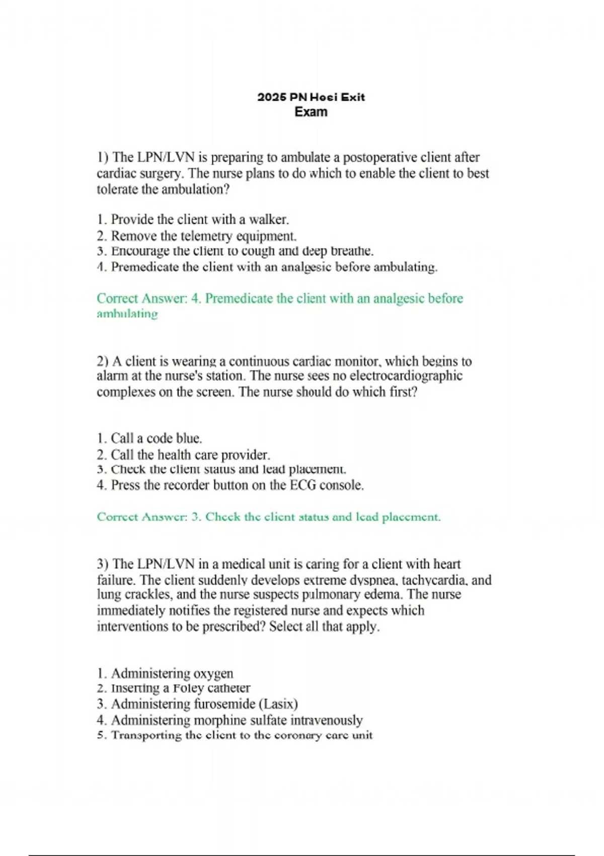 1) The LPN/LVN is preparing to ambulate a postoperative client after cardiac surgery. The nurse plans to do which to enable the client to best tolerate the ambulation? 1. Provide the client with a walker. 2. Remove the telemetry equipment. 3. Encourage the client to cough and deep breathe. 4. Premedicate the client with an analgesic before ambulating. Correct Answer: 4. Premedicate the client with an analgesic before ambulating. 2) A client is wearing a continuous cardiac monitor, which begins to alarm at the nurse's station. The nurse sees no electrocardiographic complexes on the screen. The nurse should do which first? 1. Call a code blue. 2. Call the health care provider. 3. Check the client status and lead placement. 4. Press the recorder button on the ECG console. Correct Answer: 3. Check the client status and lead placement. 3) The LPN/LVN in a medical unit is caring for a client with heart failure. The client suddenly develops extreme dyspnea, tachycardia, and lung crackles, and the nurse suspects pulmonary edema. The nurse immediately notifies the registered nurse and expects which interventions to be prescribed? Select all that apply. 1. Administering oxygen 2. Inserting a Foley catheter 3. Administering furosemide (Lasix) 4. Administering morphine sulfate intravenously 5. Transporting the client to the coronary care unit 6. Placing the client in a low-Fowler's side-lying position Correct Answer: 1. Administering oxygen 2. Inserting a Foley catheter 3. Administering furosemide (Lasix) 4) The nurse is monitoring a client following cardioversion. Which observations should be of highest priority to the nurse? 1. Blood pressure 2. Status of airway 3. Oxygen flow rate 4. Level of consciousness Correct Answer: 2. Status of airway 5) The nurse is assisting in caring for the client immediately after insertion of a permanent demand pacemaker via the right subclavian vein. The nurse prevents dislodgement of the pacing catheter by implementing which intervention? 1. Limiting movement and abduction of the left arm 2. Limiting movement and abduction of the right arm 3. Assisting the client to get out of bed and ambulate with a walker 4. Having the physical therapist do active range of motion to the right arm Correct Answer: 2. Limiting movement and abduction of the right arm 6) A client diagnosed with thrombophlebitis 1 day ago suddenly complains of chest pain and shortness of breath, and the client is visibly anxious. The LPN/LVN understands that a life-threatening complication of this condition is which? 1. Pneumonia 2. Pulmonary edema 3. Pulmonary embolism 4. Myocardial infarction Correct Answer: 3. Pulmonary embolism 7) A 24-year-old man seeks medical attention for complaints of claudication in the arch of the foot. The nurse also notes superficial thrombophlebitis of the lower leg. The nurse should check the client for which next? 1. Smoking history 2. Recent exposure to allergens 3. History of recent insect bites 4. Familial tendency toward peripheral vascular disease Correct Answer: 1. Smoking history 8) The nurse has reinforced instructions to the client with Raynaud's disease about self-management of the disease process. The nurse determines that the client needs further teaching if the client states which? 1. "Smoking cessation is very important." 2. "Moving to a warmer climate should help." 3. "Sources of caffeine should be eliminated from the diet." 4. "Taking nifedipine (Procardia) as prescribed will decrease vessel spasm." Correct Answer: 2. "Moving to a warmer climate should help." 9) A client with myocardial infarction suddenly becomes tachycardic, shows signs of air hunger, and begins coughing frothy, pink-tinged sputum. The nurse listens to breath sounds, expecting to hear which breath sounds bilaterally? 1. Rhonchi 2. Crackles 3. Wheezes 4. Diminished breath sounds Correct Answer: 2. Crackles 10) The LPN/LVN is collecting data on a client with a diagnosis of right- sided heart failure. The nurse should expect to note which specific characteristic of this condition? 1. Dyspnea 2. Hacking cough 3. Dependent edema 4. Crackles on lung auscultation Correct Answer: 3. Dependent edema 11) The LPN/LVN is checking the neurovascular status of a client who returned to the surgical nursing unit 4 hours ago after undergoing an aortoiliac bypass graft. The affected leg is warm, and the nurse notes redness and edema. The pedal pulse is palpable and unchanged from admission. The nurse interprets that the neurovascular status is which? 1. Moderately impaired, and the surgeon should be called 2. Normal, caused by increased blood flow through the leg 3. Slightly deteriorating, and should be monitored for another hour 4. Adequate from an arterial approach, but venous complications are arising Correct Answer: 2. Normal, caused by increased blood flow through the leg 12) A client with a diagnosis of rapid rate atrial fibrillation asks the nurse why the health care provider is going to perform carotid massage. The LPN/LVN responds that this procedure may stimulate which? 1. Vagus nerve to slow the heart rate 2. Vagus nerve to increase the heart rate 3. Diaphragmatic nerve to slow the heart rate 4. Diaphragmatic nerve to increase the heart rate Correct Answer: 1. Vagus nerve to slow the heart rate 13) A client is admitted to the hospital with possible rheumatic endocarditis. The LPN/LVN should check for a history of which type of infection? 1. Viral infection 2. Yeast infection 3. Streptococcal infection 4. Staphylococcal infection Correct Answer: 3. Streptococcal infection 14) A client has an Unna boot applied for treatment of a venous stasis leg ulcer. The LPN/LVN notes that the client's toes are mottled, and cool and the client verbalizes some numbness and tingling of the foot. Which interpretation should the nurse make of these findings? 1. The boot has not yet dried. 2. The boot is controlling leg edema. 3. The boot is impairing venous return. 4. The boot has been applied too tightly. Correc