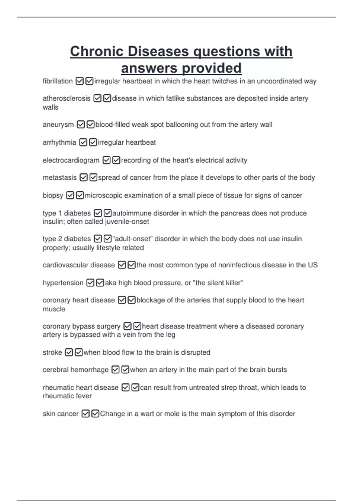 Chronic Diseases questions with answers provided fibrillation irregular heartbeat in which the heart twitches in an uncoordinated way atherosclerosis disease in which fatlike substances are deposited inside artery walls aneurysm blood-filled weak spot ballooning out from the artery wall arrhythmia irregular heartbeat