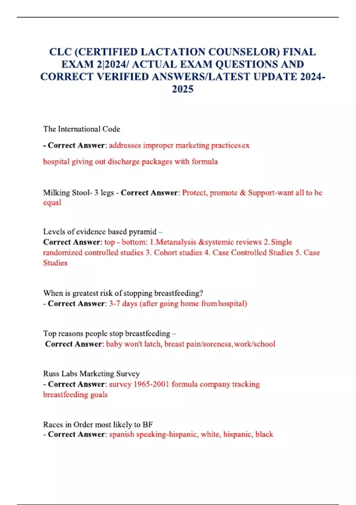 CLC (CERTIFIED LACTATION COUNSELOR) FINAL EXAM 2024/ 2025/ ACTUAL EXAM QUESTIONS AND CORRECT VERIFIED ANSWERS/ LATEST UPDATE 2024/ 2025