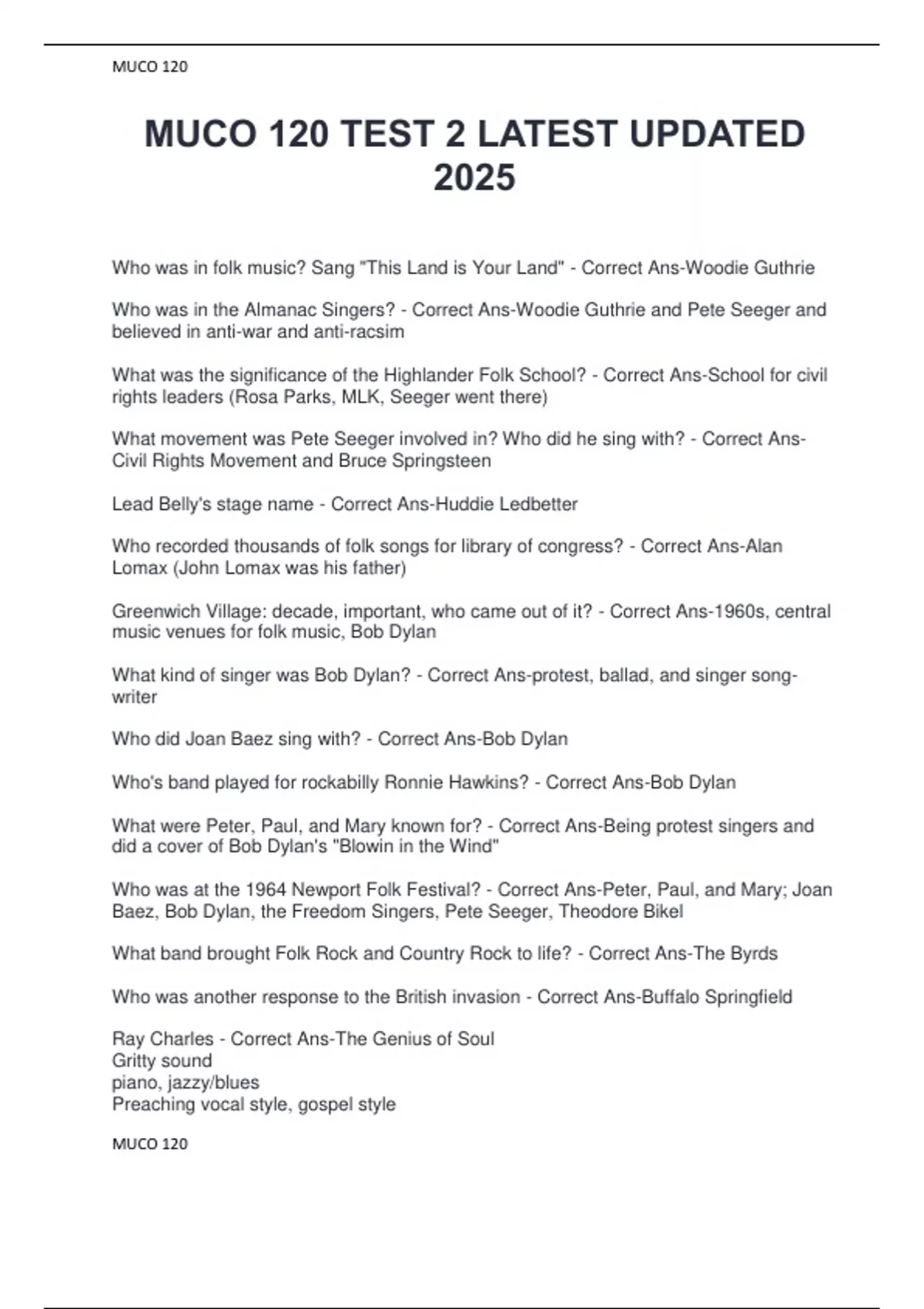 Who was in folk music? Sang "This Land is Your Land" - Correct Ans-Woodie Guthrie Who was in the Almanac Singers? - Correct Ans-Woodie Guthrie and Pete Seeger and believed in anti-war and anti-racsim What was the significance of the Highlander Folk School? - Correct Ans-School for civil rights leaders (Rosa Parks, MLK, Seeger went there) What movement was Pete Seeger involved in? Who did he sing with? - Correct Ans Civil Rights Movement and Bruce Springsteen Lead Belly's stage name - Correct Ans-Huddie Ledbetter Who recorded thousands of folk songs for library of congress? - Correct Ans-Alan Lomax (John Lomax was his father) Greenwich Village: decade, important, who came out of it? - Correct Ans-1960s, central music venues for folk music, Bob Dylan What kind of singer was Bob Dylan? - Correct Ans-protest, ballad, and singer song writer Who did Joan Baez sing with? - Correct Ans-Bob Dylan Who's band played for rockabilly Ronnie Hawkins? - Correct Ans-Bob Dylan What were Peter, Paul, and Mary known for? - Correct Ans-Being protest singers and did a cover of Bob Dylan's "Blowin in the Wind" Who was at the 1964 Newport Folk Festival? - Correct Ans-Peter, Paul, and Mary; Joan Baez, Bob Dylan, the Freedom Singers, Pete Seeger, Theodore Bikel What band brought Folk Rock and Country Rock to life? - Correct Ans-The Byrds Who was another response to the British invasion - Correct Ans-Buffalo Springfield Ray Charles - Correct Ans-The Genius of Soul Gritty sound piano, jazzy/blues Preaching vocal style, gospel style MUCO 120 MUCO 120 Influenced by country music James Brown - Correct Ans-The Godfather of Soul and funk Early sang in "the flames" - 1950's Invents "funk" Sam Cooke - Correct Ans-Sweet Soul Gospel artist that switched over to the Pop charts Influenced by doowop, and Bob Dylan Where did Motown start? - Correct Ans-Detroit Berry Gordy - Correct Ans-Founded Motown records in Detroit Used Brill Building practices to create hits for artists sounded "white" Who was in charge of the Motown Finishing School? - Correct Ans-Maxine Powell Choreographer of Motown - Correct Ans-"Cholly" Atkins Back up band for Motown - Correct Ans-The Funk Brothers Songwriters of Motown - Correct Ans-Holland Dozier and Holland (H-D-H) Two Biggest Girl Groups in Motown - Correct Ans-Martha and the Vandellas and Diana Ross and the Supremes The Tempations - Correct Ans-very cookie-cutter with choreography David Ruffin was lead singer David Ruffin - Correct Ans-Temptations, vain, died of cocaine overdose Who was one of the last Motown groups? (MJ came out of it) - Correct Ans-The Jackson Five Where was John Myers from? - Correct Ans-Knoxville Who founded STAX records? - Correct Ans-Jim Stewart and Estelle Axton Where was the location of STAX records? - Correct Ans-Memphis (also teamed with Atlantic records) back up band for STAX - Correct Ans-Booker T and the MGs Who came out of STAX and died in plane crash? - Correct Ans-Otis Redding MUCO 120 MUCO 120 Who owned Atlantic Records? - Correct Ans-Jerry Wexler Who went to FAME records and created the jerk dance? - Correct Ans-Wilson Pickett Where was the location of FAME records? - Correct Ans-Muscle Shores, AL Aretha Franklin - Correct Ans-Queen of Soul and sang at MLK's funeral What city did American counterculture (hippie) come out of? - Correct Ans-San Francisco Where did psychedelic rock come out of? - Correct Ans-Haight Ashbury Who did the first big drug gathering? - Correct Ans-Alan Ginsburg at the Human Be-in Timothy Leary - Correct Ans-would use drugs to get to a higher sate of conciousness Who created 'can you pass the acid test?' - Correct Ans-Ken Kesey and the Merry Pranksters Where were most drug concerts held? - Correct Ans-The Filmore Auditorium and The Avalon Ballroom The Grateful Dead - Correct Ans-epitome of psychedelic rock and had folk influence Jefferson Airplane - Correct Ans-Grace Slick (powerful female lead singer), introduced psychedelic rock to mainstream audience Janis Joplin - Correct Ans-Became a sex symbol and died at 27 Monterey Pop Festival - Correct Ans-"Music, Love, and Flowers," 200,000 people The Who, Janis Joplin, and Jimi Hendrix were there Jimi Hendrix - Correct Ans-In the army One of greatest guitar players of all time Went to England and became prominent part of British Blues Revival Known for destroying guitar at shows Who Built Electric Lady Land Studios? - Correct Ans-Jimi Hendrix Edgard Varese - Correct Ans-"father of electronic music" Woodstock Music and Art Fair - Correct Ans-450,000 people 3 days of peace and music Hendrix did rendition of star-spangled banner Crosby, Stills, and Nash first appeared- Folk Rock Super group MUCO 120 MUCO 120 Who created the Petsounds album? - Correct Ans-Brian Wilson in the Beach Boys What person did the Beatles follow in psychedelic rock? - Correct Ans-Indian Guru Maharishi Mahesh Yogi St. Peppers Lonely Hearts Club Band - Correct Ans-Beatles' most expensive album rock's first concept album The "White Album" - Correct Ans-Sound collage Abbey Road - Correct Ans-the Beatle's last and most successful album Important members of the Beatles - Correct Ans-Ringo Starr George Harrison Paul and Linda McCartney John Lennon and Yoko Ono Lou Reed - Correct Ans-at Big Ears Festival in Knoxville what band was Lou Reed apart of? - Correct Ans-The Velvet Underground with Nico and Andy Warhol Jim Morrison of the Doors influenced by this band The term for the darker side of the psychedelic drug use - Correct Ans-The Exploding Plastic Inevitable The Rolling stones - Correct Ans-Made a psychedelic concept album Altamont Concert - Correct Ans-Meredith Hunter - guy stabbed by Hell's Angels after flashing a gun What decade realized that you can make a lot of