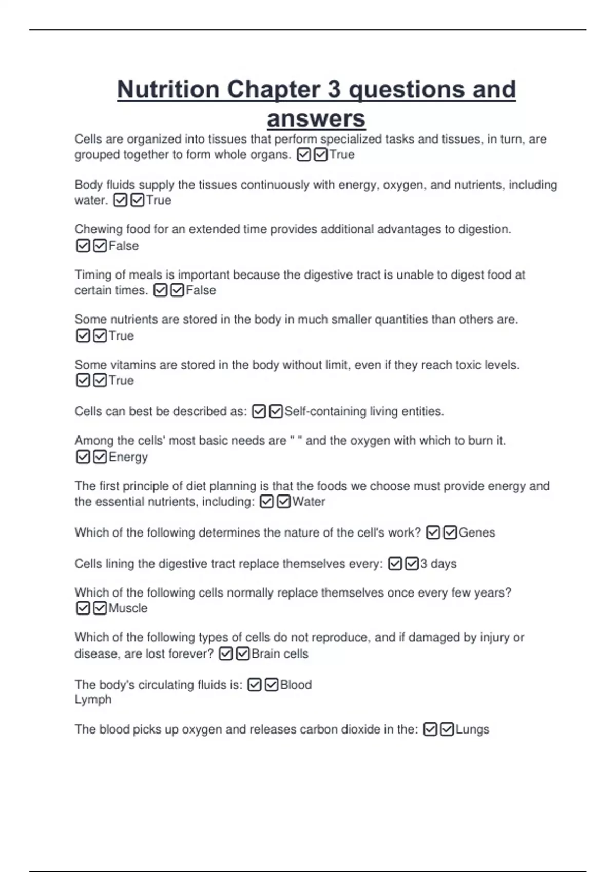 Nutrition Chapter 3 questions and answers Cells are organized into tissues that perform specialized tasks and tissues, in turn, are grouped together to form whole organs. True Body fluids supply the tissues continuously with energy, oxygen, and nutrients, including water. True Chewing food for an extended time provides additional advantages to digestion. False Timing of meals is important because the digestive tract is unable to digest food at certain times. False