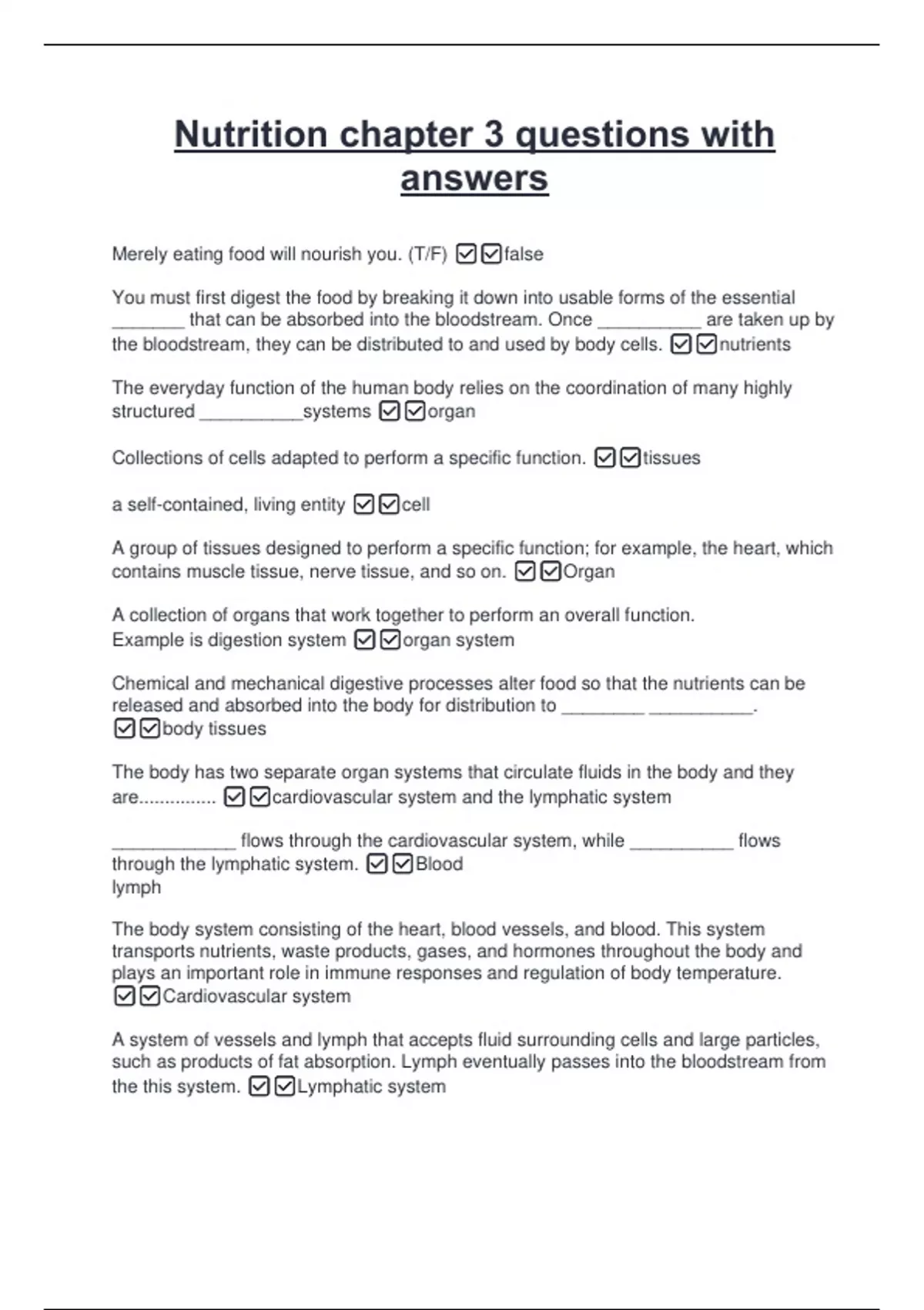 Nutrition chapter 3 questions with answers Merely eating food will nourish you. (T/F) false You must first digest the food by breaking it down into usable forms of the essential _______ that can be absorbed into the bloodstream. Once __________ are taken up by the bloodstream, they can be distributed to and used by body cells. nutrients The everyday function of the human body relies on the coordination of many highly structured __________systems organ Collections of cells adapted to perform a specific function. tissues a self-contained, living entity cell