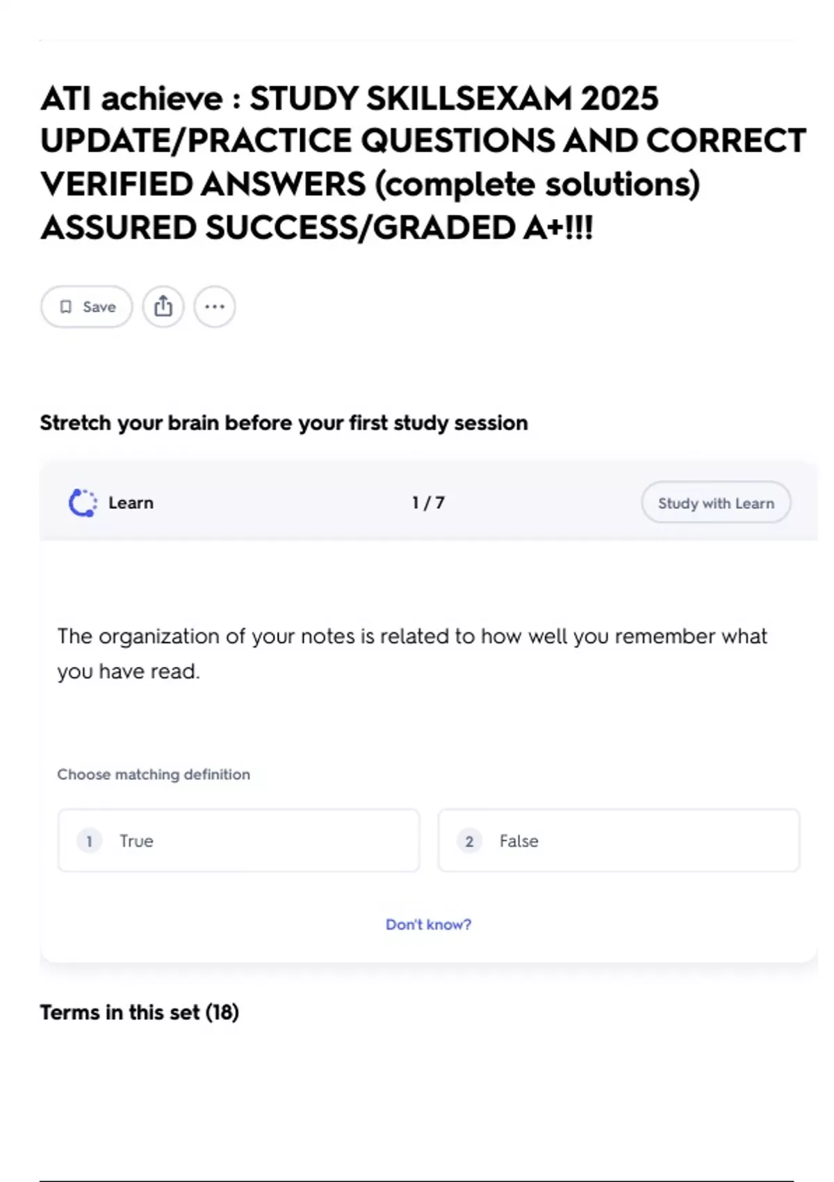 ATI achieve : STUDY SKILLSEXAM 2025 UPDATE/PRACTICE QUESTIONS AND CORRECT VERIFIED ANSWERS (complete solutions) ASSURED SUCCESS/GRADED A+!!!