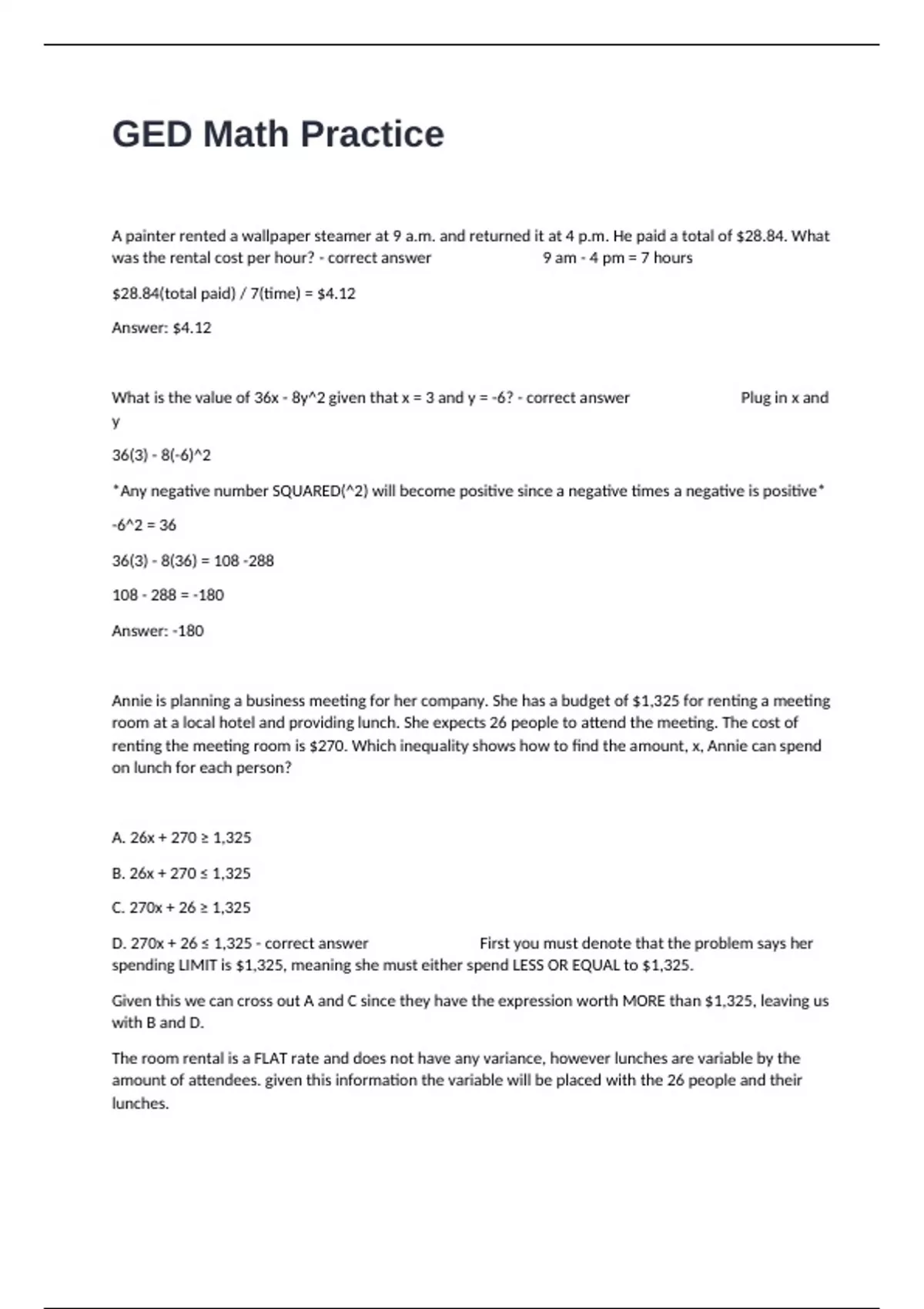 GED Math Practice Exam Review Questions And Answers Verified Solutions.