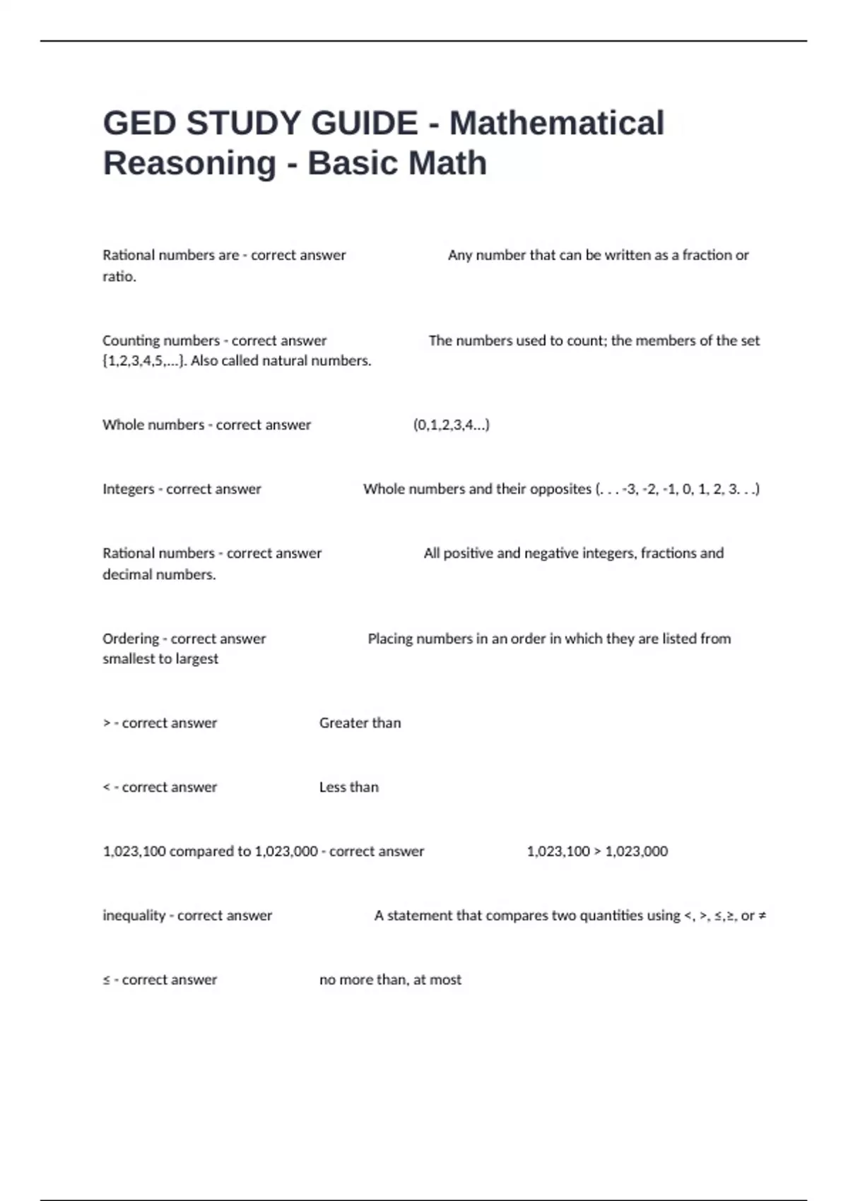 Rational numbers are - correct answer Any number that can be written as a fraction or ratio. Counting numbers - correct answer The numbers used to count; the members of the set {1,2,3,4,5,...}. Also called natural numbers. Whole numbers - correct answer (0,1,2,3,4...) Integers - correct answer Whole numbers and their opposites (. . . -3, -2, -1, 0, 1, 2, 3. . .) Rational numbers - correct answer All positive and negative integers, fractions and decimal numbers. Ordering - correct answer Placing numbers in an order in which they are listed from smallest to largest - correct answer Greater than - correct answer Less than 1,023,100 compared to 1,023,000 - correct answer 1,023,100 1,023,000 inequality - correct answer A statement that compares two quantities using , , ≤,≥, or ≠ ≤ - correct answer no more than, at most ≥ - correct answer No less than, at least Numerator - correct answer the top number in a fraction Denominator - correct answer The bottom number in a fraction Unit fraction - correct answer a fraction with a numerator of 1 Multiples - correct answer The numbers that result from multiplying a given whole number by the set of whole numbers (e.g., the multiples of 12 are 0, 12, 24, 36, 48, 60). least common multiple (LCM) - correct answer The smallest multiple those numbers have in common. Factors - correct answer Numbers that are multiplied to get a product. 1, 2, 3, 4, 6, 12 are factors of 12. 1 x 12 = 12. 2 x 6 = 12. 3 x 4 = 12. Prime factorization - correct answer a whole number expressed as a product of factors that are all called prime numbers Exponents - correct answer repeated multiplication of the same thing by itself 5³ = 5 x 5 x 5 = 125 Fractional Exponents - correct answer A power with an exponent that is a fraction. To turn into a radical, make the denominator your index, and the numerator your exponent on the radicand. Negative exponents - correct answer If your exponent is negative, move it to the opposite side of the fraction bar to make it positive. PEMDAS - correct answer The order in which you do problems with more than one operation. (P=Parenthesis E=Exponent M=Multiplication D=Division A=Addition S=Subtraction) (You usually multiply or divide first from left to right, then add from left to right.) absolute value - correct answer the distance between a number and zero; can never be negative Sum - correct answer addition: "the sum of 9 and 4" is 13 common denominator - correct answer the common multiple of two or more denominators (when using fractions) Difference - correct answer subtraction: "the difference of 9 and 4" is 5 Product - correct answer multiplication: "the product of 9 and 4" is 36 Quotient - correct answer division: "the quotient of 9 and 4" is 9/4=2.25 (2 1/4) Dividend - correct answer The number to be divided; goes inside. Divisor - correct answer The number used to divide another number; goes outside. Reciprocal - correct answer the number by which another number can be multiplied to produce 1, if you have a fraction its reciprocal is that fraction turned upside down Proper fraction - correct answer when the numerator is less than its denominator improper fraction - correct answer a fraction whose numerator is larger than the denominator 36/12 mixed number - correct answer A number that has a whole-number part and a fractional part. Example: 5½ Estimation - correct answer The use of rounding and/or other strategies to determine a reasonably accurate approximation, without calculating an exact answer (e.g., clustering, front-end estimating, grouping). Rounding - correct answer Replaces one number with another number that tells about how much or how many. Numbers are rounded to a multiple of 10, 100, 1,000, etc. Remember the rule: 5 or more raise the score; 5 or less let it rest. Decimal system - correct answer the decimal, or base 10, system is a # system that uses ten different digits (0-9) Decimal point - correct answer a dot seperating the whole number from the fraction Example: 3.45 decimal number - correct answer Any number written with a decimal point in the number. A decimal number falls between two whole numbers (e.g., 4.7 falls between 5 and 6). Decimal numbers smaller than 1 are sometimes called decimal fractions (e.g., three-tenths is written 0.3). terminating decimal - correct answer a decimal number in which the decimal digits come to an end repeating decimal - correct answer a decimal in which a pattern of one or more digits is repeated indefinitely, such as 0.353535 ... Commutative Property of Addition - correct answer 5+4 = 4+5 Commutative Property of Multiplication - correct answer 3 x 2 = 2 x 3 Associative Property of Addition - correct answer (8 + 7) + 1 = 8 + (7 + 1) Associative Property of Multiplication - correct answer (7 x 2) x 6 = 7 x (2 x 6) Identity Property of Multiplication - correct answer a × 1 = a Identity Property of addition - correct answer any number plus zero is still that same number Inverse Property of Addition - correct answer Any number added to its inverse equals 0. 1 + -1 = 0 Inverse Property of Multiplication - correct answer Any number multiplied by its reciprocal equals 1. 2 x 1/2 = 2/1 x 1/2 = 1