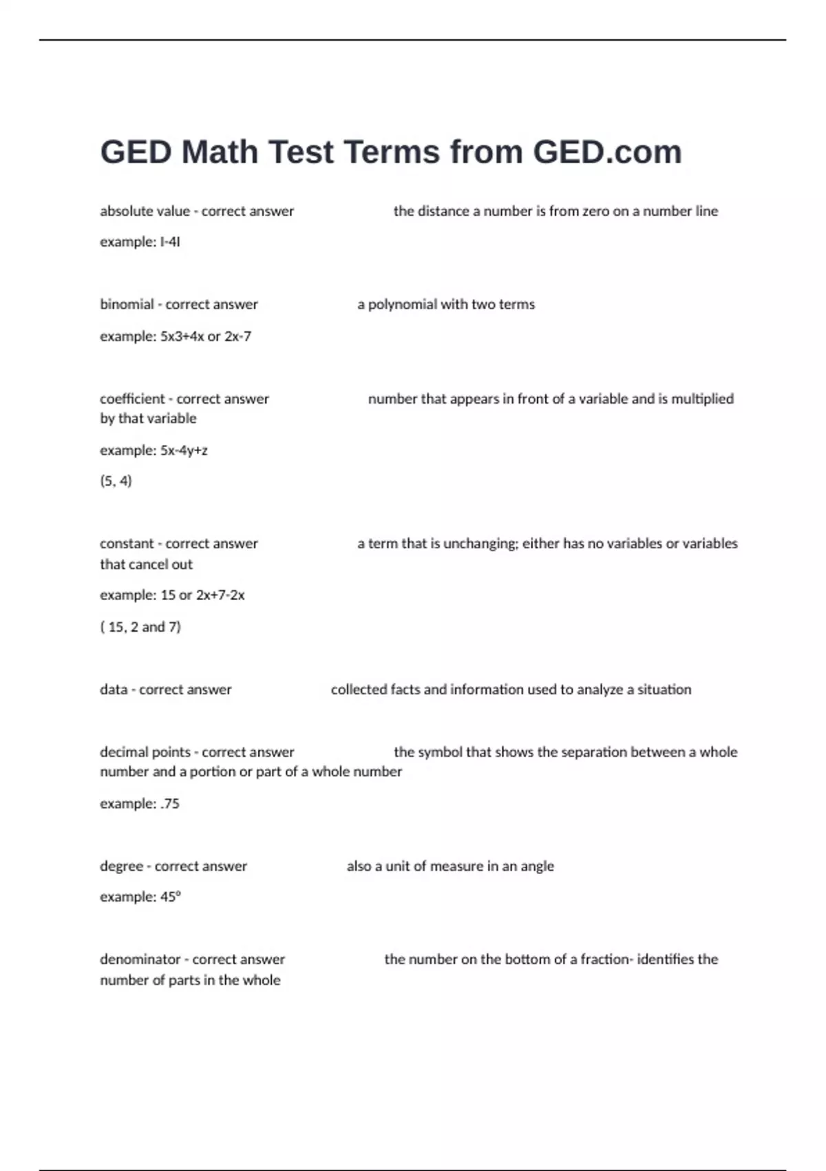 GED Math Test Terms from GED.com Final Exam Questions And Answers Well Defined.