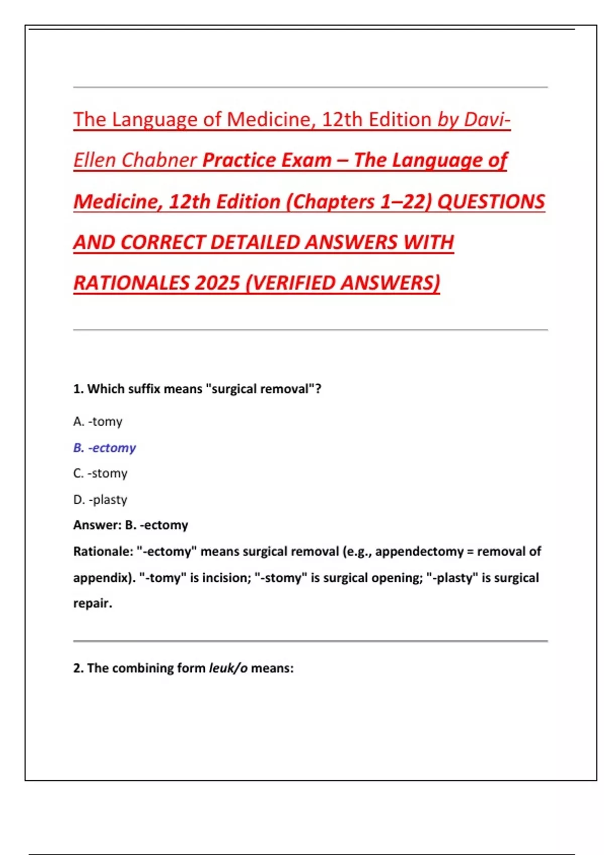 The Language of Medicine, 12th Edition by DaviEllen Chabner Practice Exam – The Language of Medicine, 12th Edition (Chapters 1–22) QUESTIONS AND CORRECT DETAILED ANSWERS WITH RATIONALES 2025 (VERIFIED ANSWERS)