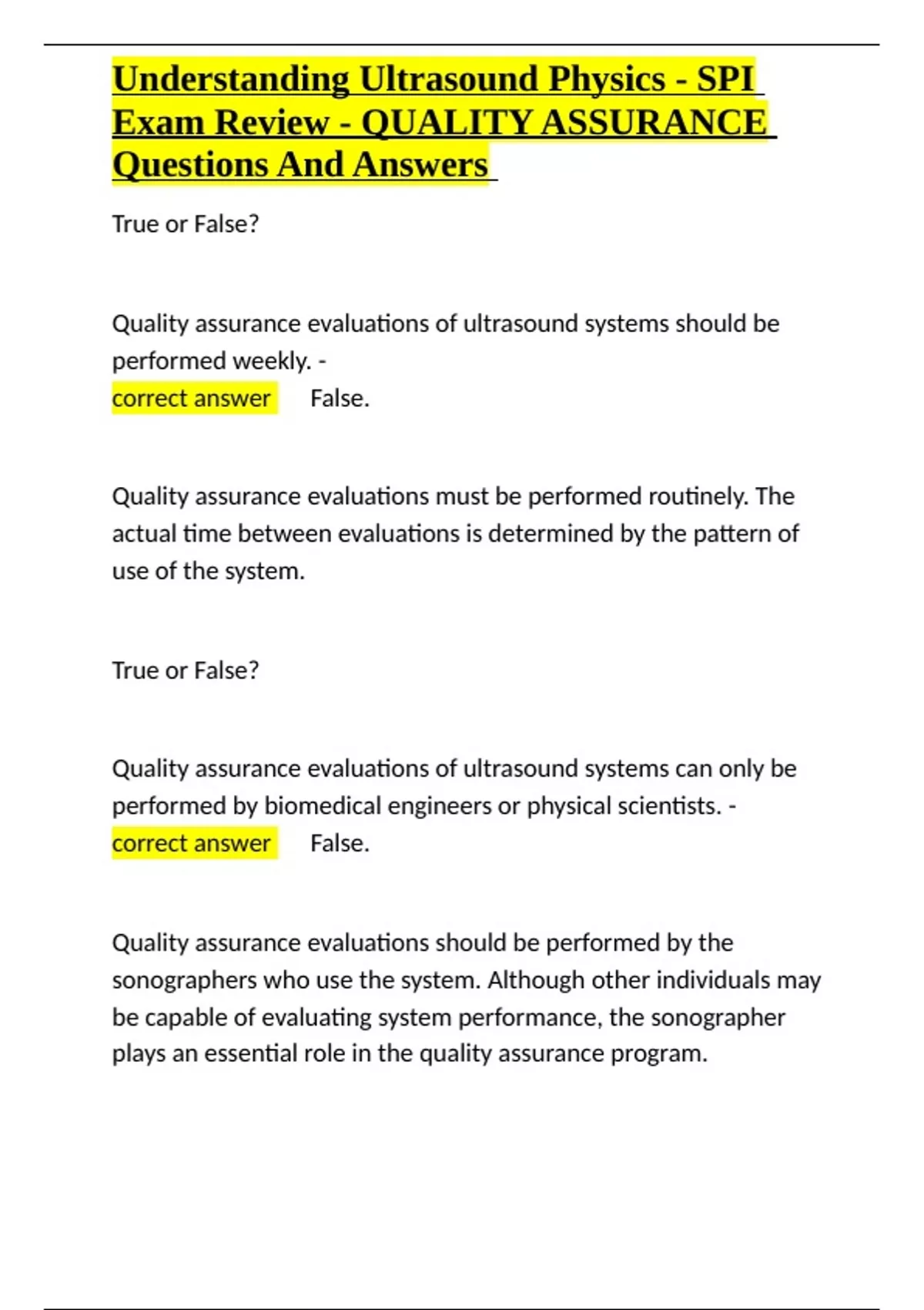 Understanding Ultrasound Physics - SPI Exam Review - QUALITY ASSURANCE Questions And A