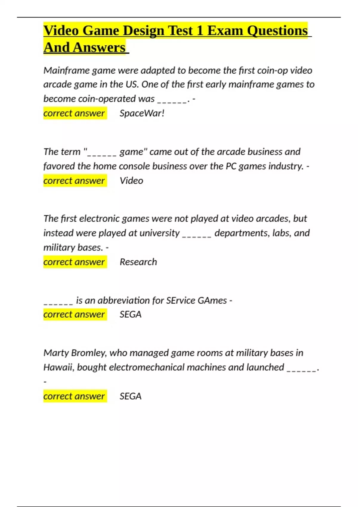 Video Game Design Test 1 Exam Questions And Answers.docx