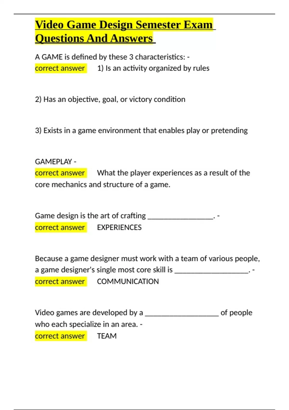 , Video Game Design Semester Exam