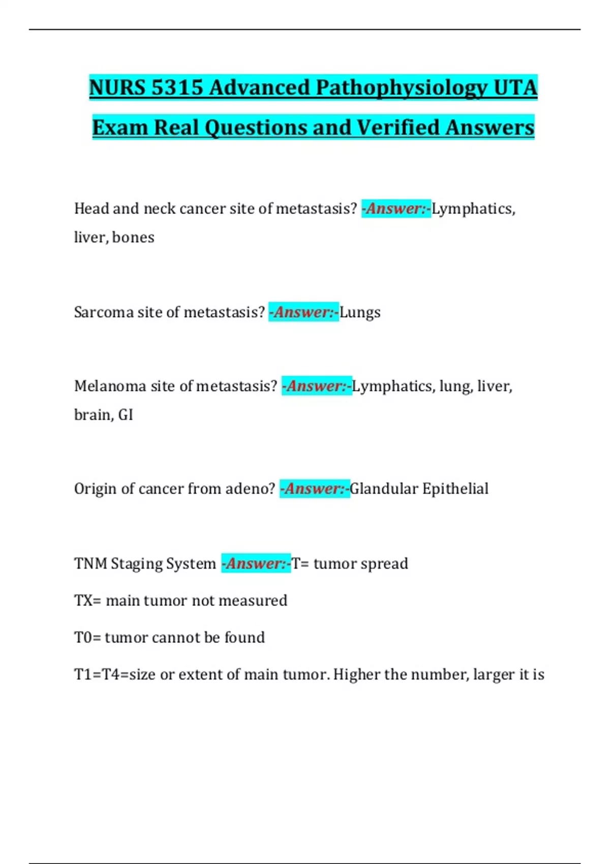 NURS 5315 Advanced Pathophysiology UTA Exam Real Questions and Verified Answers Head and neck cancer site of metastasis? -Answer:-Lymphatics, liver, bones Sarcoma site of metastasis? -Answer:-Lungs Melanoma site of metastasis? -Answer:-Lymphatics, lung, liver, brain, GI Origin of cancer from adeno? -Answer:-Glandular Epithelial