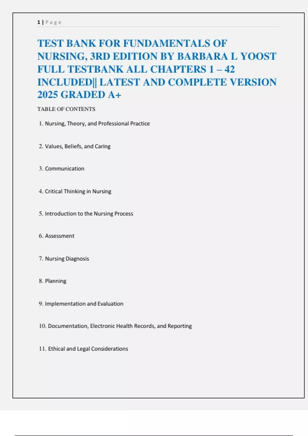 TESTBANK FOR FUNDAMENTALS OF NURSING, 3RD EDITION BY BARBARA L YOOST FULL TESTBANK ALL CHAPTERS 1 – 42 INCLUDED|| LATEST AND COMPLETE VERSION 2025 GRADED A+