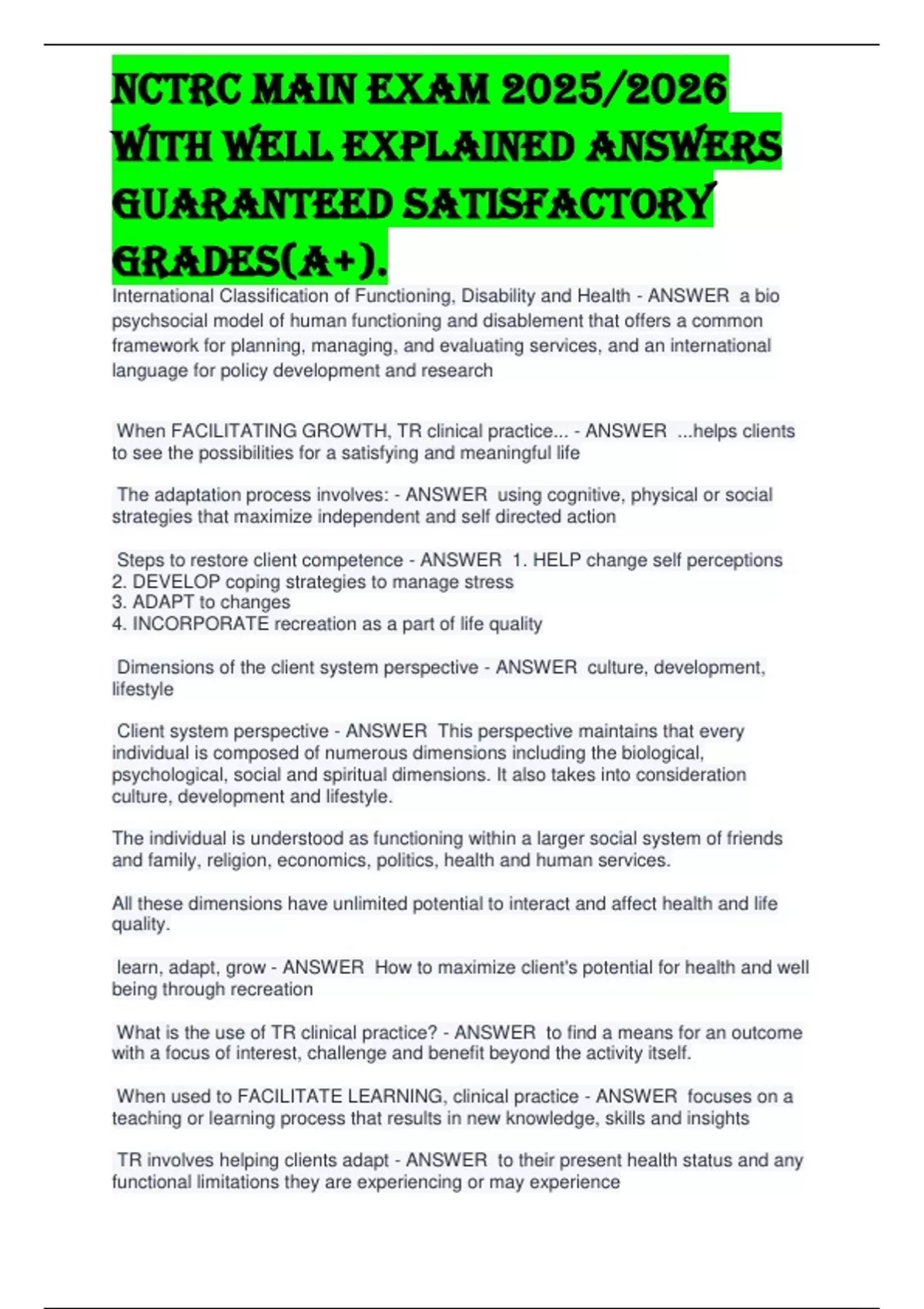 International Classification of Functioning, Disability and Health - ANSWER a bio psychsocial model of human functioning and disablement that offers a common framework for planning, managing, and evaluating services, and an international language for policy development and research When FACILITATING GROWTH, TR clinical practice... - ANSWER ...helps clients to see the possibilities for a satisfying and meaningful life The adaptation process involves: - ANSWER using cognitive, physical or social strategies that maximize independent and self directed action Steps to restore client competence - ANSWER 1. HELP change self perceptions 2. DEVELOP coping strategies to manage stress 3. ADAPT to changes 4. INCORPORATE recreation as a part of life quality Dimensions of the client system perspective - ANSWER culture, development, lifestyle Client system perspective - ANSWER This perspective maintains that every individual is composed of numerous dimensions including the biological, psychological, social and spiritual dimensions. It also takes into consideration culture, development and lifestyle. The individual is understood as functioning within a larger social system of friends and family, religion, economics, politics, health and human services. All these dimensions have unlimited potential to interact and affect health and life quality.