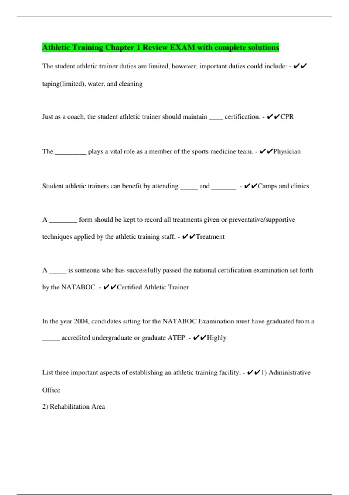The student athletic trainer duties are limited, however, important duties could include: - taping(limited), water, and cleaning Just as a coach, the student athletic trainer should maintain ____ certification. - CPR The _________ plays a vital role as a member of the sports medicine team. - Physician Student athletic trainers can benefit by attending _____ and _______. - Camps and clinics A ________ form should be kept to record all treatments given or preventative/supportive techniques applied by the athletic training staff. - Treatment A _____ is someone who has successfully passed the national certification examination set forth by the NATABOC. - Certified Athletic Trainer In the year 2004, candidates sitting for the NATABOC Examination must have graduated from a _____ accredited undergraduate or graduate ATEP. - Highly List three important aspects of establishing an athletic training facility. - 1) Administrative Office