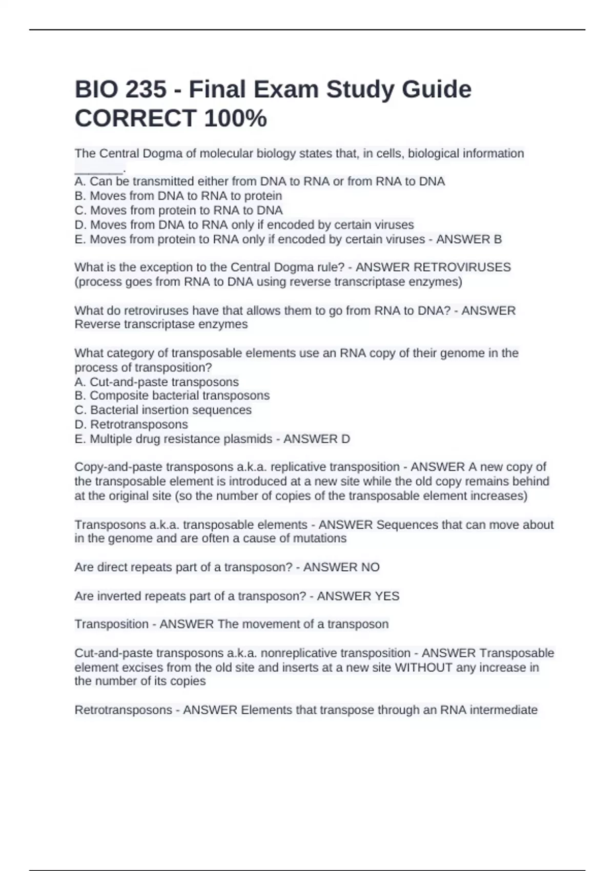 The Central Dogma of molecular biology states that, in cells, biological information _______. A. Can be transmitted either from DNA to RNA or from RNA to DNA B. Moves from DNA to RNA to protein C. Moves from protein to RNA to DNA D. Moves from DNA to RNA only if encoded by certain viruses E. Moves from protein to RNA only if encoded by certain viruses - ANSWER B What is the exception to the Central Dogma rule? - ANSWER RETROVIRUSES (process goes from RNA to DNA using reverse transcriptase enzymes) What do retroviruses have that allows them to go from RNA to