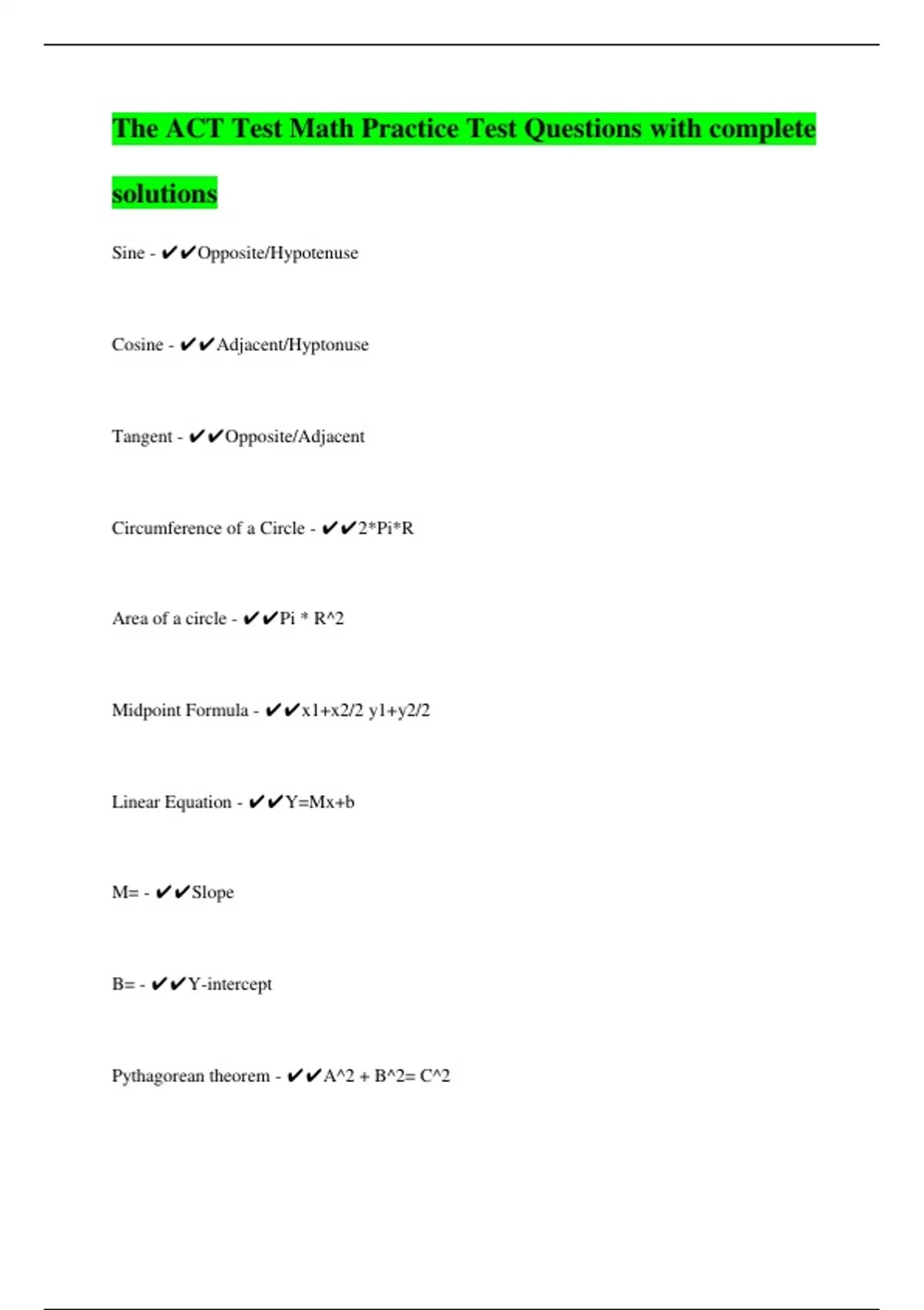 The ACT Test Math Practice Test Questions with complete solutions