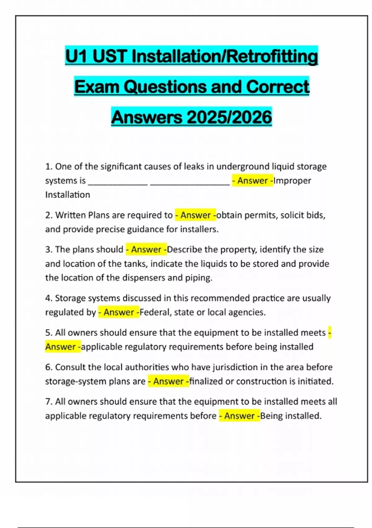 U1 UST Installation/Retrofitting Exam Questions and Correct Answers 2025/2026 1. One of the significant causes of leaks in underground liquid storage systems is ____________ ________________ - Answer -Improper Installation 2. Written Plans are required to - Answer -obtain permits, solicit bids, and provide precise guidance for installers. 3. The plans should - Answer -Describe the property, identify the size and location of the tanks, indicate the liquids to be stored and provide the location of the dispensers and piping. 4. Storage systems discussed in this recommended practice are usually regulated by - Answer -Federal, state or local agencies. 5. All owners should ensure that the equipment to be installed meets - Answer -applicable regulatory requirements before being installed 6. Consult the local authorities who have jurisdiction in the area before storage-system plans are - Answer -finalized or construction is initiated. 7. All owners should ensure that the equipment to be installed meets all applicable regulatory requirements before - Answer -Being installed.8. To avoid damage tanks must not be - Answer -dropped, dragged, or handled with sharp objects. 9. Tanks must not be dropped, dragged, or handled with sharp objects to avoid - Answer -Damage to the tank 10. The only time tanks really should be moved is when - Answer -for inspections and testing. 11. If a tanks is damaged at all throughout the moving process it must be - Answer -Repaired in accordance with the manufacture's instructions. 12. The proper way to move a tank is by lifting it, using the - Answer - Lift lugs that are installed by the manufacturer. 13. Tanks should be carefully lifted and lowered using - Answer -Cables or chains of adequate length. 14. When two lifting lugs are being used, the angle between the lifting cable and vertical should be no more th