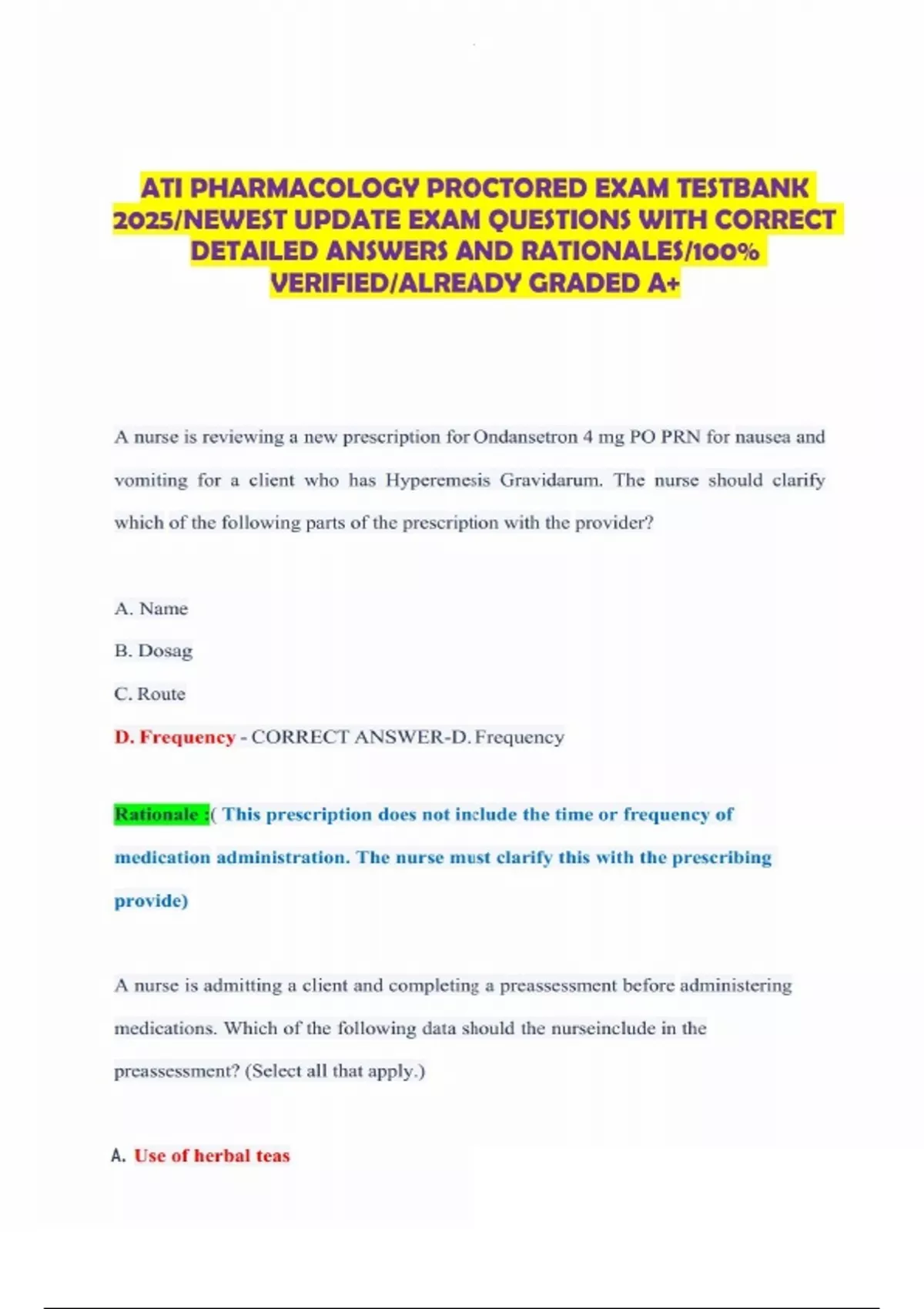 ATI PHARMACOLOGY PROCTORED EXAM TESTBANK 2025 NEWEST UPDATE EXAM QUESTIONS WITH CORRECT DETAILED ANSWERS AND RATIONALES 100% VERIFIED ATI PHARMACOLOGY PROCTORED EXAM TESTBANK 2025 NEWEST UPDATE EXAM QUESTIONS WITH CORRECT DETAILED ANSWERS AND RATIONALES 100% VERIFIED