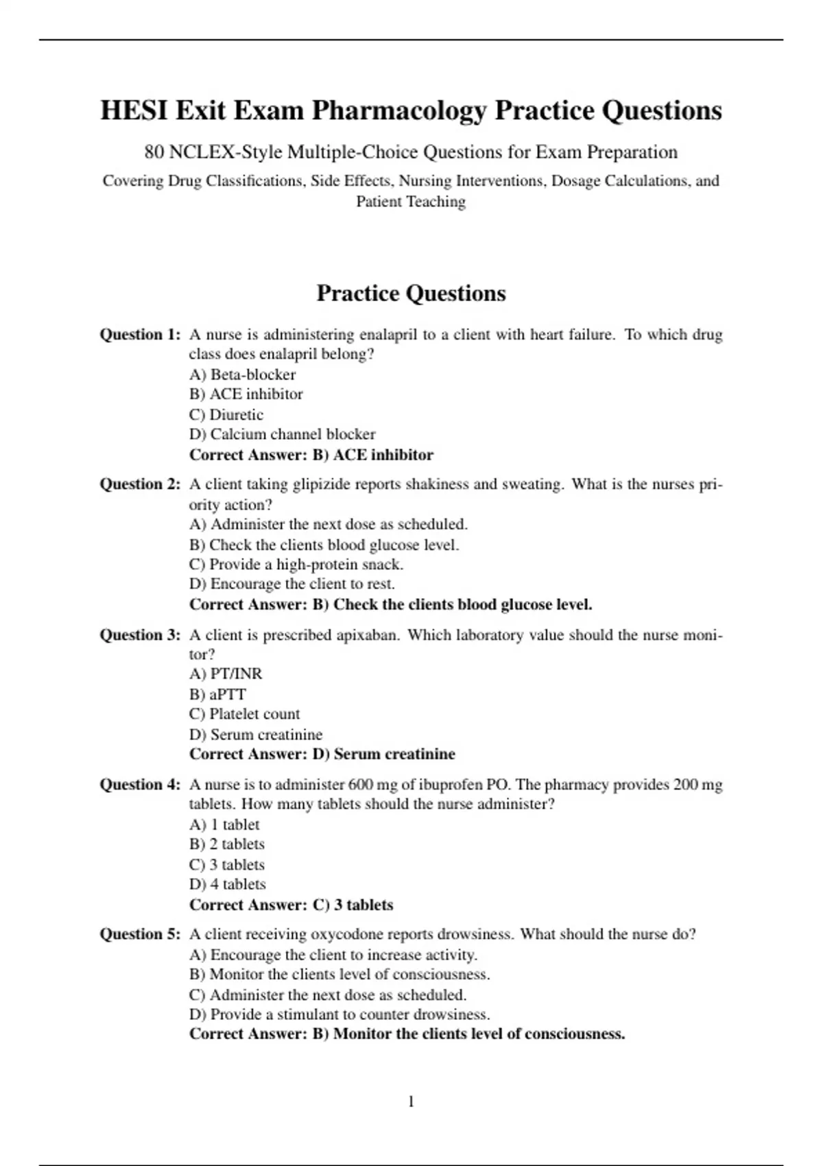 Question 1: A nurse is administering enalapril to a client with heart failure. To which drug