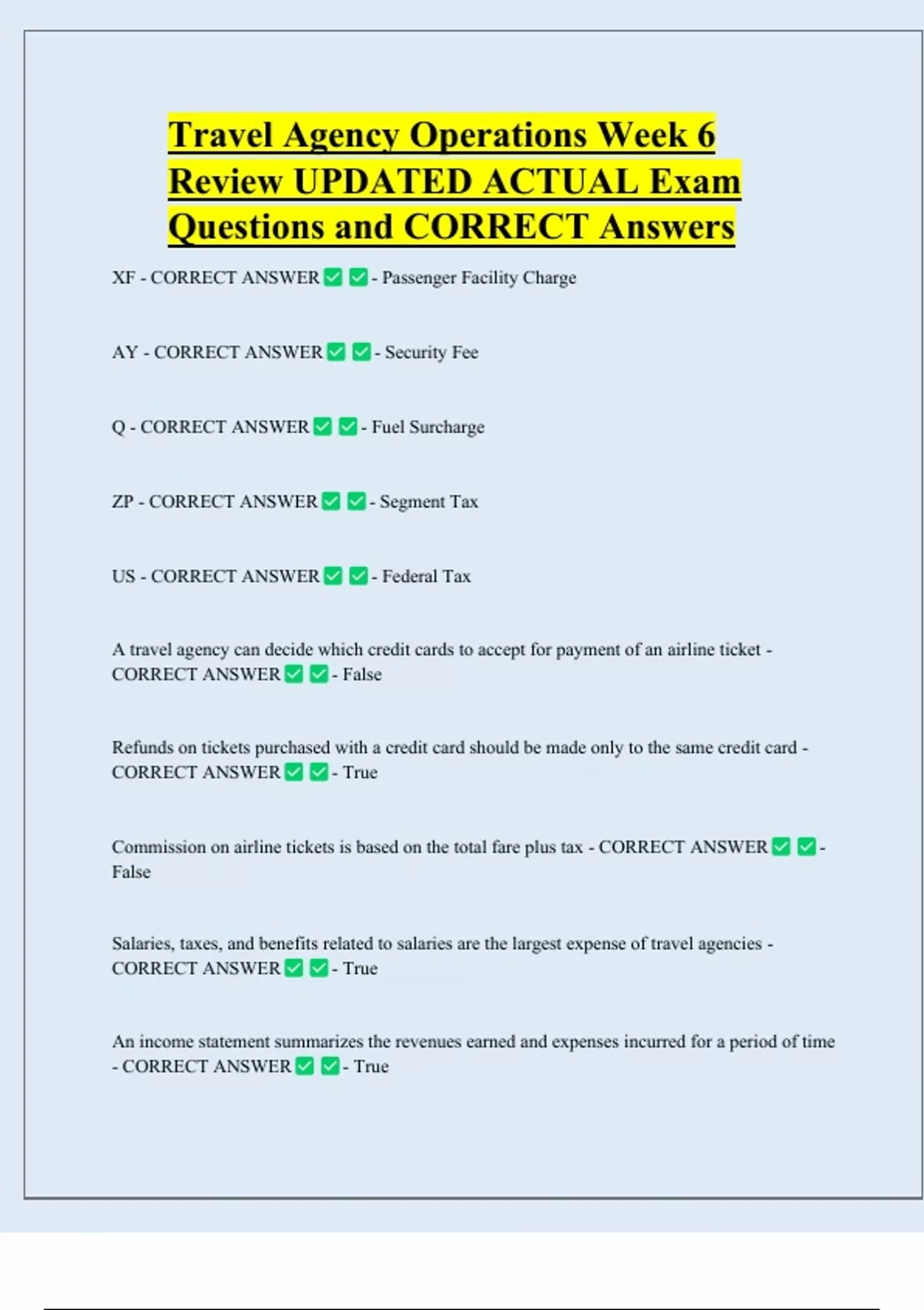 Travel Agency Operations Week 6 Review UPDATED ACTUAL Exam Questions and CORRECT Answers XF - CORRECT ANSWER AY - CORRECT ANSWER Q - CORRECT ANSWER ZP - CORRECT ANSWER US - CORRECT ANSWER - Passenger Facility Charge - Security Fee - Fuel Surcharge - Segment Ta