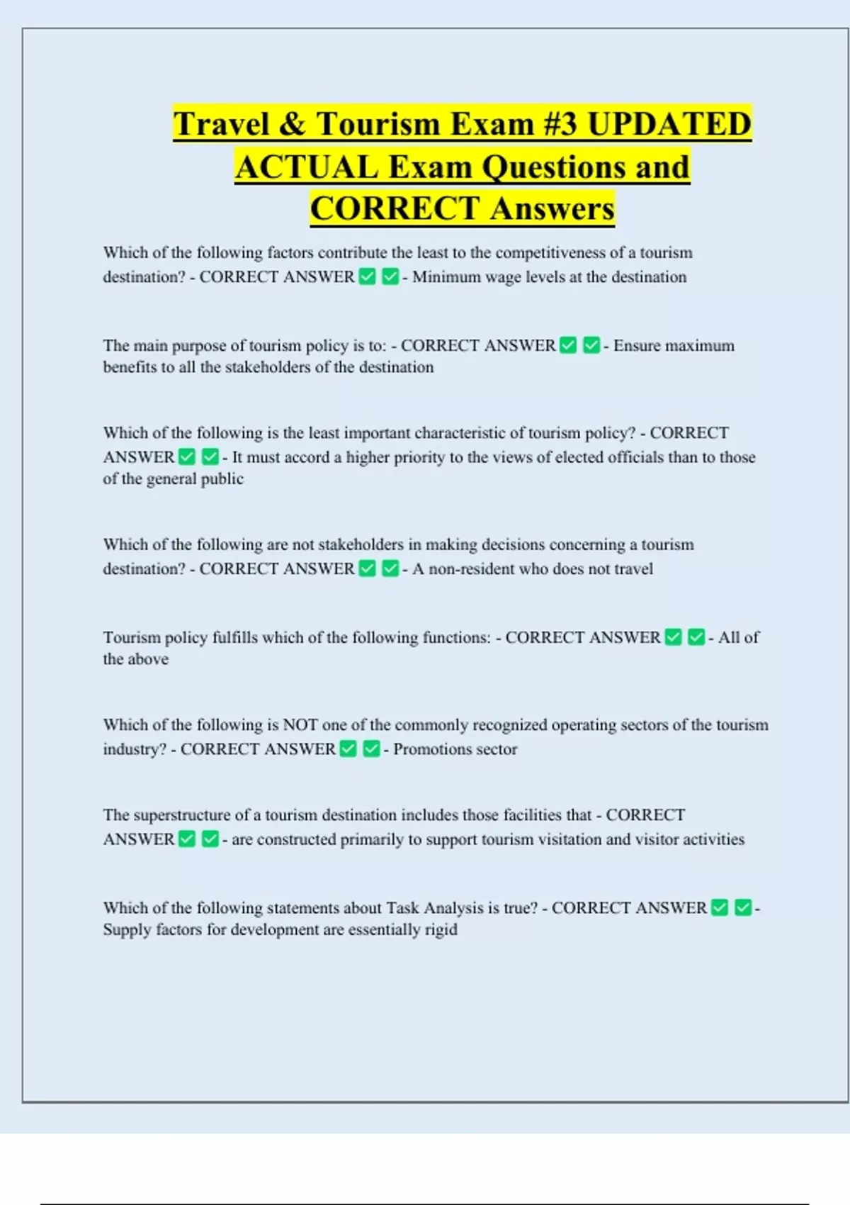 The main purpose of tourism policy is to: - CORRECT ANSWER - Ensure maximum