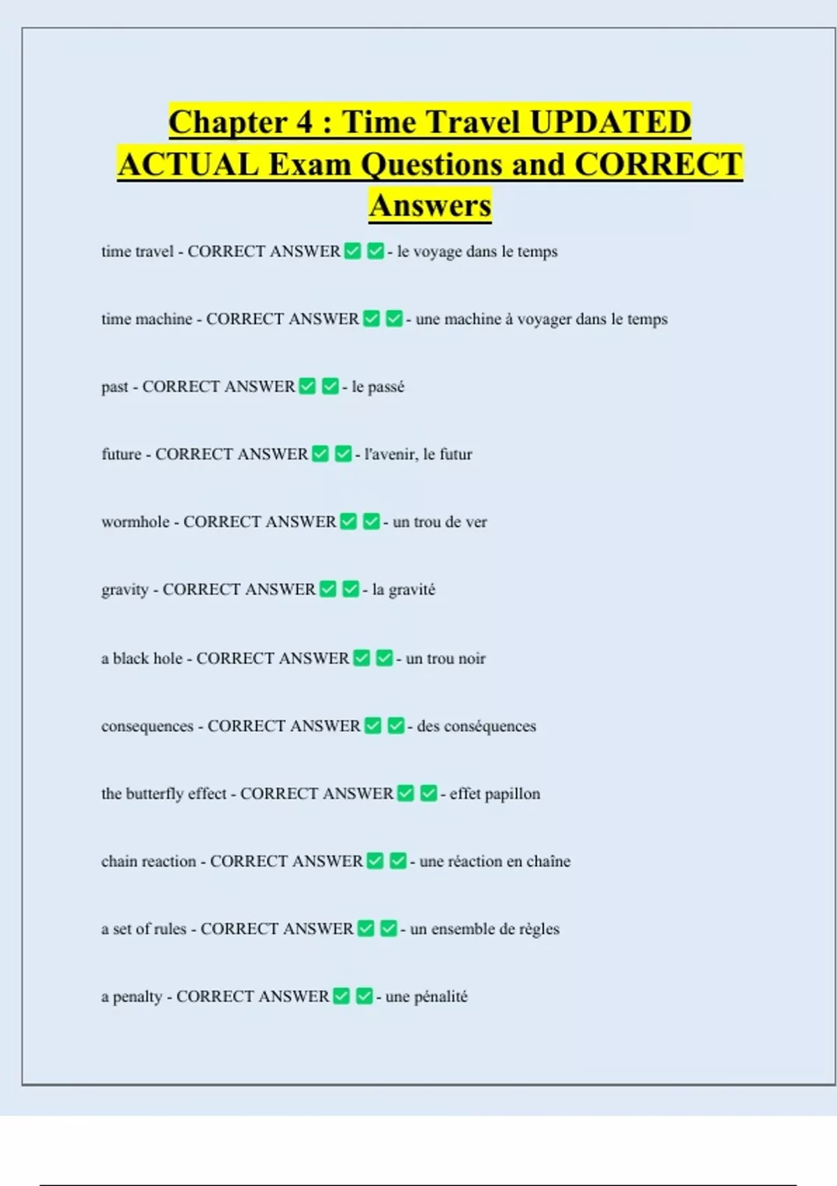Chapter 4 : Time Travel UPDATED ACTUAL Exam Questions and CORRECT Answers time travel - CORRECT ANSWER time machine - CORRECT ANSWER past - CORRECT ANSWER - le voyage dans le temps - une machine à voyager dans le temps - le passé future - CORRECT ANSWER wormhole - CORRECT ANSWER gravity - CORRECT ANSWER a black hole - CORRECT ANSWER - l'avenir, le futur - un trou de ver