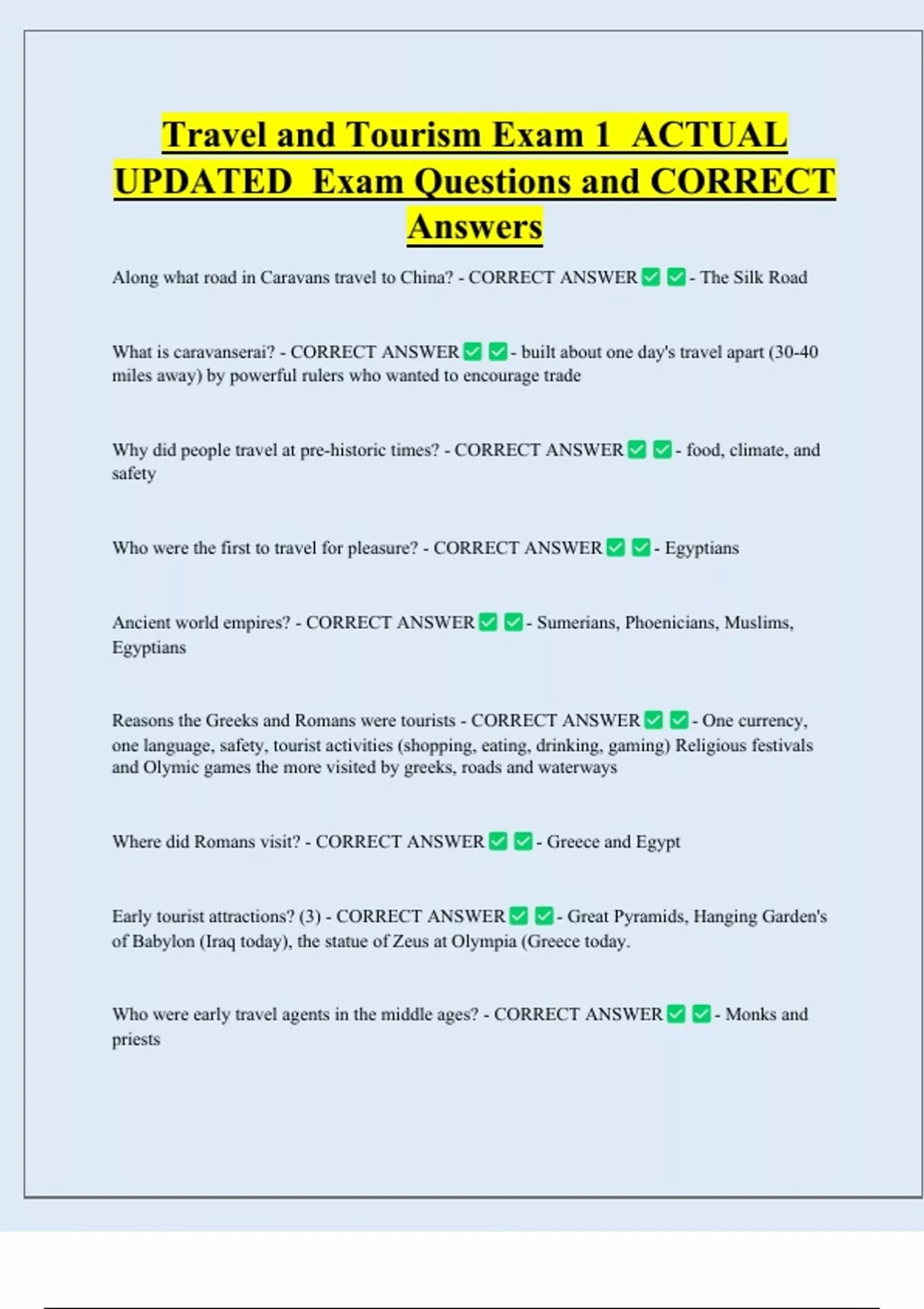 Travel and Tourism Exam 1 ACTUAL UPDATED Exam Questions and CORRECT Answers Along what road in Caravans travel to China? - CORRECT ANSWER What is caravanserai? - CORRECT ANSWER - The Silk Road - built about one day's travel apart (30-40 miles away) by powerful rulers who wanted to encourage trade Why did people travel at pre-historic times? - CORRECT ANSWER safety Who were the first to travel for pleasure? - CORRECT ANSWER Ancient world empires? - CORRECT ANSWER - food, climate, and - Egyptian