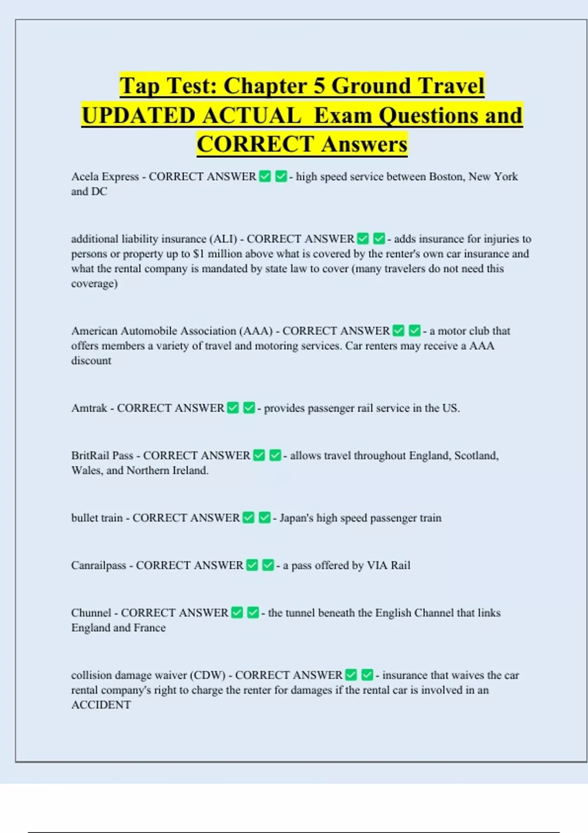 Tap Test: Chapter 5 Ground Travel UPDATED ACTUAL Exam Questions and CORRECT Answers Acela Express - CORRECT ANSWER and DC - high speed service between Boston, New York additional liability insurance (ALI) - CORRECT ANSWER - adds insurance for injuries to persons or property up to $1 million above what is covered by the renter's own car insurance and what the rental company is mandated by state law to cover (many travelers do not need this coverage) American Automobile Association (AAA) - CORRECT ANSWER - a motor club that offers members a variety of travel and motoring services. Car renters may receive a A