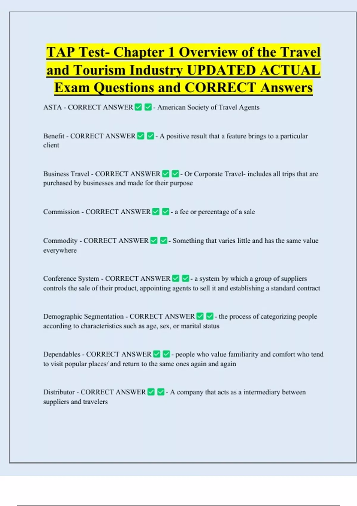 ASTA - CORRECT ANSWER - American Society of Travel Agents