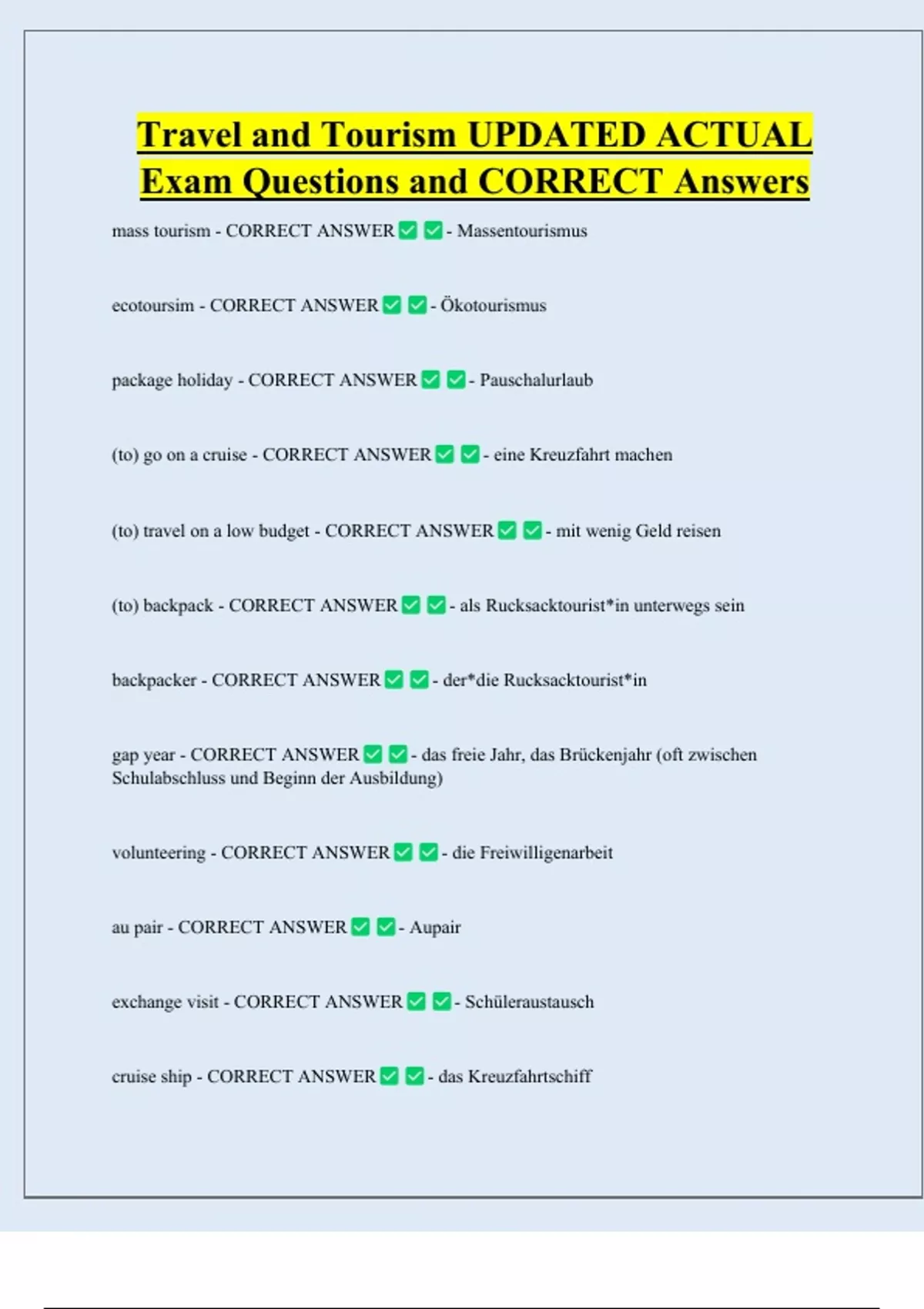 Travel and Tourism UPDATED ACTUAL Exam Questions and CORRECT Answers mass tourism - CORRECT ANSWER ecotoursim - CORRECT ANSWER package holiday - CORRECT ANSWER (to) go on a cruise - CORRECT ANSWER - Massentourismus - Ökotourismus - Pauschalurlaub - eine Kreuzfahrt machen (to) travel on a low budget - CORRECT ANSWER (to) backpack - CORRECT ANSWER - mit wenig Geld reisen - als Rucksacktourist*in unterwegs sein